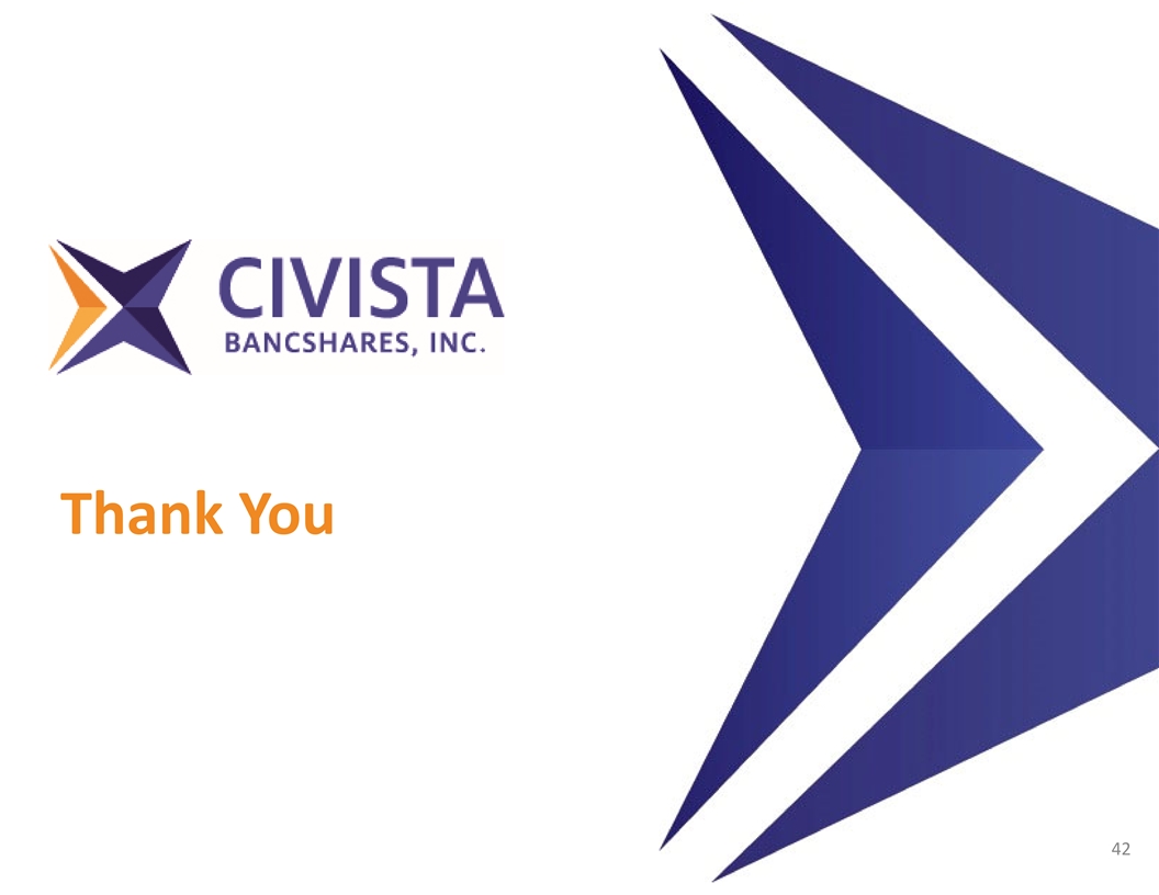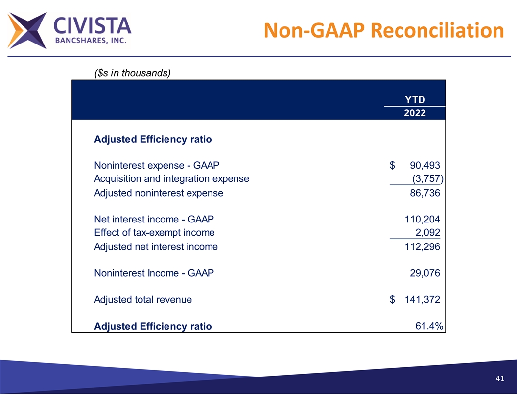 Non‐GAAP Reconciliation ($s in thousands) YTD 2022 Adjusted Efficiency ratio Noninterest expense - GAAP $ 90,493 Acquisition and integration expense (3,757) Adjusted noninterest expense 86,736 Net interest income - GAAP 110,204 Effect of tax-exempt income 2,092 Adjusted net interest income 112,296 Noninterest Income - GAAP 29,076 Adjusted total revenue $ 141,372 61.4% Adjusted Efficiency ratio 41