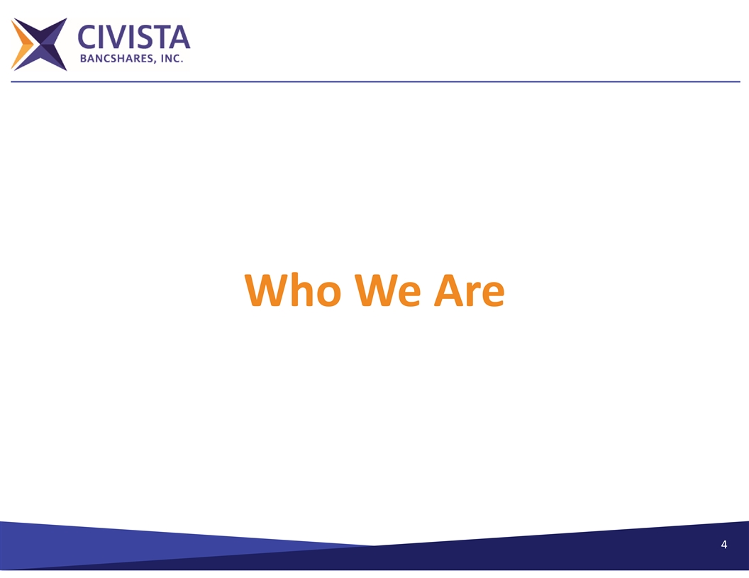 Contact Information Ø Civista Bancshares, Inc.’s common shares are traded on the NASDAQ Capital Market under the symbol “CIVB.” Ø Additional information can be found at: Ø www.civb.com Ø Dennis G Shaffer Ø Chief Executive Officer & President Ø dgshaffer@civista.bank Ø Telephone: 888.645.4121 3