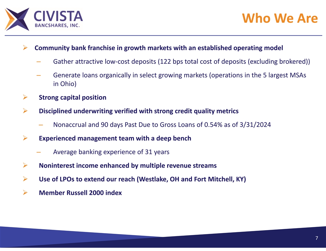 Who We Are Ø Northwest Ohio Ø Sandusky/Norwalk/Port Clinton, Ohio Ø 7 Locations Ø 9 Locations Ø $157 million in loans Ø $460 million in loans Ø $179 million in Ø $1,480 million in deposits deposits Ø #1 deposit market share in Sandusky, Ø 17% deposit market Ohio with ~53% share Ø Civista Leasing & Ø Cleveland/Akron, Ø Columbus & West Central, Finance Ohio Ohio Ø $57 million in Ø 3 Locations Ø 6 Locations financing leases Ø $897 million in Ø $579 million in loans Ø $54 million in loans commercial loans Ø $231 million in deposits Ø $144 million in Ø $25 million in deposits Ø 27% deposit market share in operating leases the rural markets Ø Southeastern Indiana/Cincinnati, Ohio Ø North Central, Ohio Ø Greater Dayton, Ohio Ø 9 Locations Ø 6 Locations Ø 3 Locations Ø $532 million in loans Ø $41 million in loans Ø $117 million in loans Ø $591 million in deposits Ø $222 million in deposits Ø $134 million in Ø ~44% deposit market share deposits Ø ~39% deposit market share 6 Deposit market share information as of June 30, 2023.