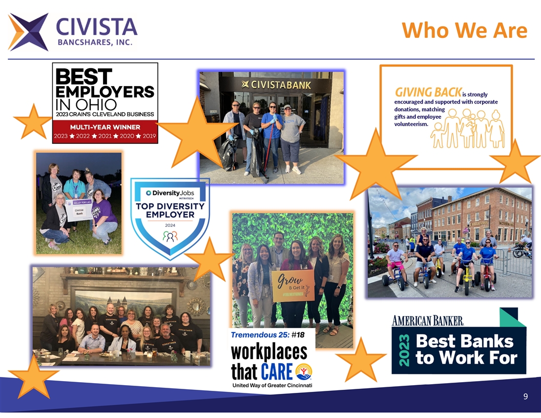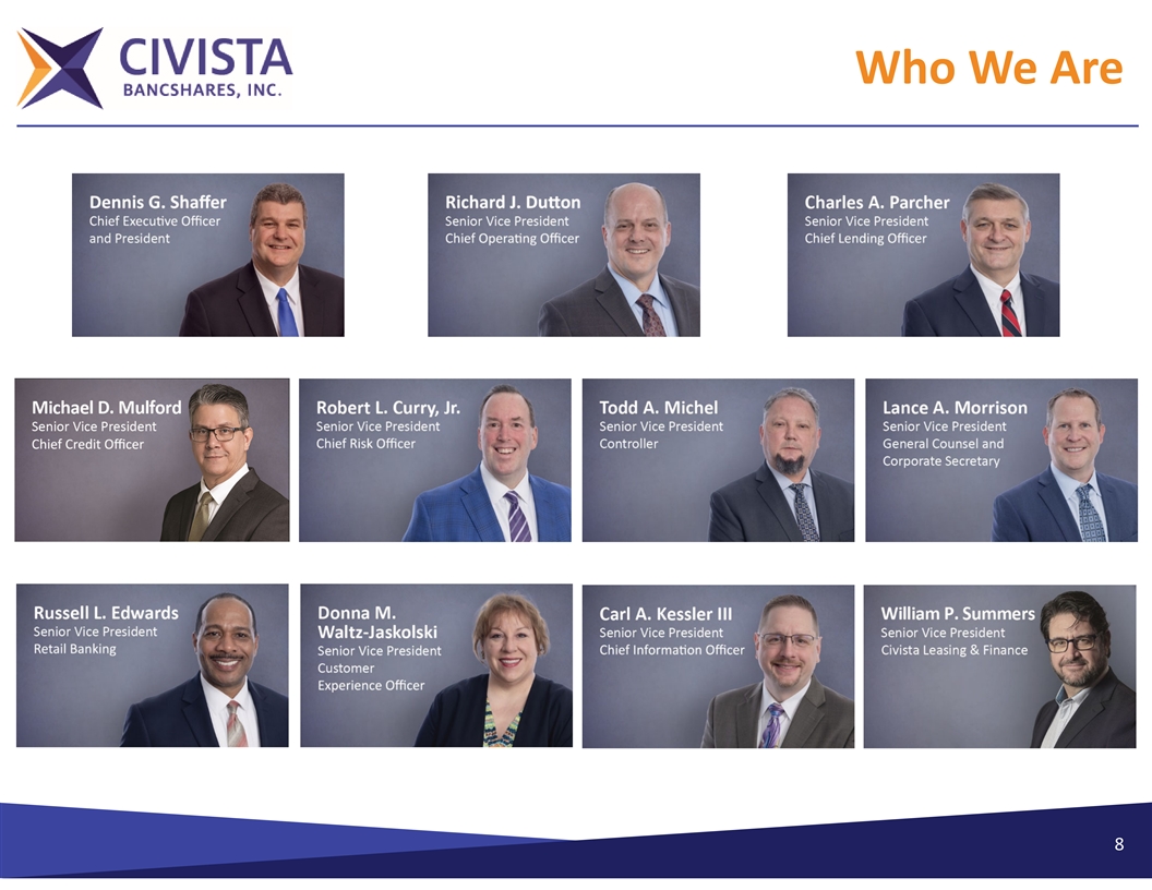 Who We Are Ø Community bank franchise in growth markets with an established operating model – Gather attractive low‐cost deposits (122 bps total cost of deposits (excluding brokered)) – Generate loans organically in select growing markets (operations in the 5 largest MSAs in Ohio) Ø Strong capital position Ø Disciplined underwriting verified with strong credit quality metrics – Nonaccrual and 90 days Past Due to Gross Loans of 0.54% as of 3/31/2024 Ø Experienced management team with a deep bench – Average banking experience of 31 years Ø Noninterest income enhanced by multiple revenue streams Ø Use of LPOs to extend our reach (Westlake, OH and Fort Mitchell, KY) Ø Member Russell 2000 index 7