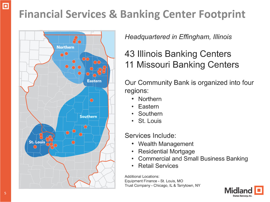 3 3 Company Snapshot Financial Highlights as of March 31, 2024 $7.8 Billion Total Assets $6.0 Billion Total Loans $6.3 Billion Total Deposits $3.9 Billion Assets Under Administration 0.72% YTD Adjusted ROAA (1) : 9.34% YTD Adjusted Return on TCE (1) : 6.58% TCE/TA: 1.67% YTD PTPP (1) ROAA: Dividend Yield: 4.93 % 1.07x Price/Tangible Book: 9.5x Price/LTM EPS: Notes: (1) Represents a non - GAAP financial measure. See “Non - GAAP Reconciliation” in the appendix. Founded in 1881, this Illinois state - chartered community bank focuses on in - market relationships while having national diversification through equipment finance. • 53 Branches in Illinois and Missouri • 16 successful acquisitions since 2008