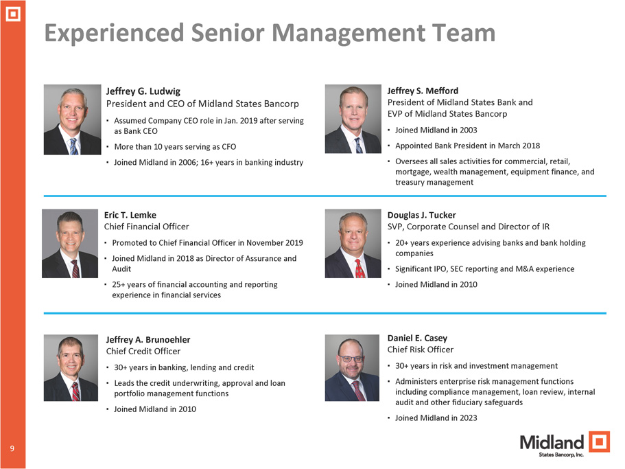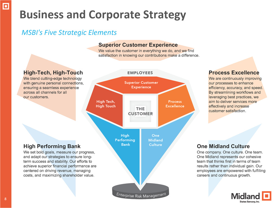 8 Business and Corporate Strategy MSBI's Five Strategic Elements Superior Customer Experience We value the customer in everything we do, and we find satisfaction in knowing our contributions make a difference. 8 Process Excellence We are continuously improving our processes to enhance efficiency, accuracy, and speed. By streamlining workflows and leveraging best practices, we aim to deliver services more effectively and increase customer satisfaction. High - Tech, High - Touch We blend cutting - edge technology with genuine personal connections, ensuring a seamless experience across all channels for all our customers. One Midland Culture One company. One culture. One team. One Midland represents our cohesive team that thinks first in terms of team results rather than individual gain. Our employees are empowered with fulfilling careers and continuous growth. High Performing Bank We set bold goals, measure our progress, and adapt our strategies to ensure long - term success and stability. Our efforts to achieve superior financial performance are centered on driving revenue, managing costs, and maximizing shareholder value.