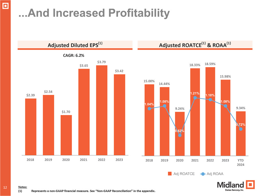 ...And Increased Profitability Adjusted Diluted EPS (1) CAGR: 6.2% Adjusted ROATCE (1) & ROAA (1) 15.00% 14.44% 9.24% 18.33% 18.59% 15.98% 9.34% 1.04% 1.08% 0.62% 1.21% 1.18% 1.08% 0.72% Adj ROATCE Adj ROAA 2018 2019 2020 2021 2022 2023 YTD 2024 $2.39 11 12 Notes: (1) Represents a non - GAAP financial measure. See “Non - GAAP Reconciliation” in the appendix. $2.54 $1.70 $3.65 $3.79 $3.42 2018 2019 2020 2021 2022 2023