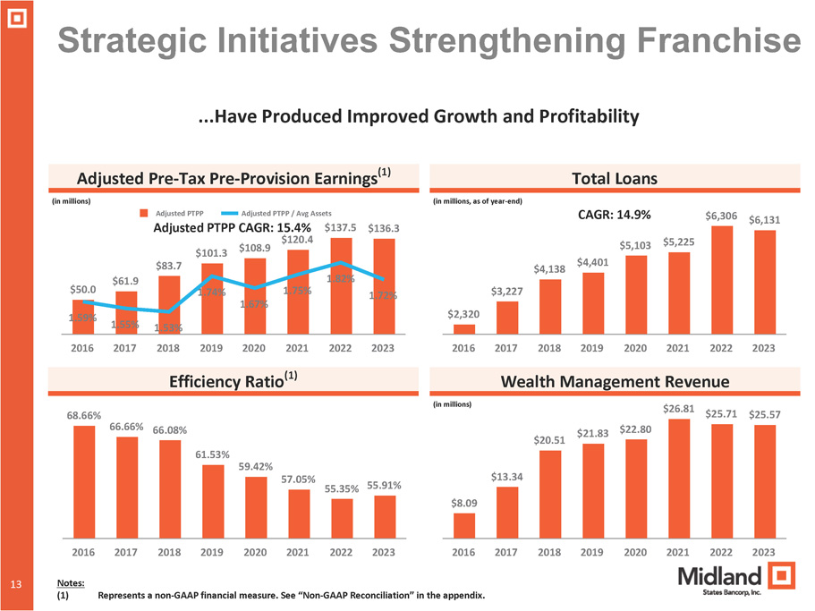 Strategic Initiatives Strengthening Franchise ...Have Produced Improved Growth and Profitability Adjusted Pre - Tax Pre - Provision Earnings (1) (in millions) Total Loans (in millions, as of year - end) 2016 2017 2018 2019 2020 2021 2022 2023 Efficiency Ratio (1) 2016 2017 2018 2019 2020 2021 2022 2023 Wealth Management Revenue (in millions) $50.0 $61.9 $83.7 $101.3 $108.9 $120.4 $137.5 $136.3 1.59% 1.55% 1.53% 1.74% 1.67% 1.75% 1.82% 1.72% Adjusted PTPP Adjusted PTPP / Avg Assets Adjusted PTPP CAGR: 15.4% $2,320 $3,227 $4,138 $4,401 $5,103 $5,225 $6,306 $6,131 CAGR: 14.9% 68.66% 66.66% 66.08% 61.53% 59.42% 57.05% 55.35% 55.91% 2016 2017 2018 2019 2020 2021 2022 2023 $8.09 11 13 Notes: (1) Represents a non - GAAP financial measure. See “Non - GAAP Reconciliation” in the appendix. $13.34 $20.51 $21.83 $22.80 $26.81 $25.71 $25.57 2016 2017 2018 2019 2020 2021 2022 2023
