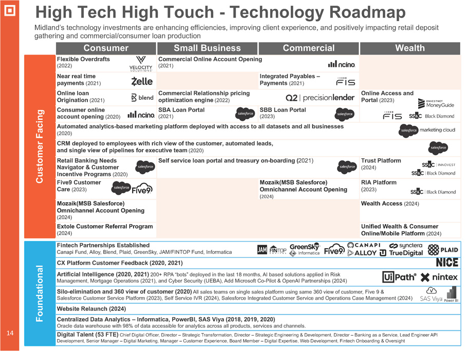 14 High Tech High Touch - Technology Roadmap Midland’s technology investments are enhancing efficiencies, improving client experience, and positively impacting retail deposit gathering and commercial/consumer loan production Customer Facing Foundational Fintech Partnerships Established Canapi Fund, Alloy, Blend, Plaid, GreenSky, JAM/FINTOP Fund, Informatica CX Platform Customer Feedback (2020, 2021) Artificial Intelligence (2020, 2021) 200+ RPA “bots” deployed in the last 18 months, AI based solutions applied in Risk Management, Mortgage Operations (2021), and Cyber Security (UEBA), Add Microsoft Co - Pilot & OpenAI Partnerships (2024) Silo - elimination and 360 view of customer (2020) All sales teams on single sales platform using same 360 view of customer, Five 9 & Salesforce Customer Service Platform (2023), Self Service IVR (2024), Salesforce Integrated Customer Service and Operations Case Management (2024) Website Relaunch (2024) Centralized Data Analytics – Informatica, PowerBI, SAS Viya (2018, 2019, 2020) Oracle data warehouse with 98% of data accessible for analytics across all products, services and channels. Digital Talent (53 FTE) Chief Digital Officer, Director – Strategic Transformation, Director – Strategic Engineering & Development, Director – Banking as a Service, Lead Engineer API Development, Senior Manager – Digital Marketing, Manager – Customer Experience, Board Member – Digital Expertise, Web Development, Fintech Onboarding & Oversight Wealth Commercial Small Business Consumer Commercial Online Account Opening (2021) Flexible Overdrafts (2022) Integrated Payables – Payments (2021) Near real time payments (2021) Online Access and Portal (2023) Commercial Relationship pricing optimization engine (2022) Online loan Origination (2021) SBB Loan Portal (2023) SBA Loan Portal (2021) Consumer online account opening (2020) Automated analytics - based marketing platform deployed with access to all datasets and all businesses (2020) CRM deployed to employees with rich view of the customer, automated leads, and single view of pipelines for executive team (2020) Trust Platform (2024) Self service loan portal and treasury on - boarding ( 2021) Retail Banking Needs Navigator & Customer Incentive Programs (2020) RIA Platform ( 2023) Mozaik(MSB Salesforce) Omnichannel Account Opening (2024) Five9 Customer Care (2023) Wealth Access (2024) Mozaik(MSB Salesforce) Omnichannel Account Opening (2024) Unified Wealth & Consumer Online/Mobile Platform (2024) Extole Customer Referral Program (2024)