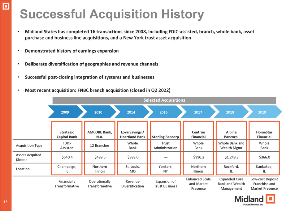 Successful Acquisition History ▪ Midland States has completed 16 transactions since 2008, including FDIC - assisted, branch, whole bank, asset purchase and business line acquisitions, and a New York trust asset acquisition ▪ Demonstrated history of earnings expansion ▪ Deliberate diversification of geographies and revenue channels ▪ Successful post - closing integration of systems and businesses ▪ Most recent acquisition: FNBC branch acquisition (closed in Q2 2022) HomeStar Alpine Centrue Love Savings / AMCORE Bank, Strategic Financial Bancorp. Financial Sterling Bancorp Heartland Bank N.A. Capital Bank Whole Bank Whole Bank and Wealth Mgmt Whole Bank Trust Administration Whole Bank 12 Branches Acquisition Type A FDIC - d ssiste $366.0 $1,243.3 $990.2 — $889.0 $499.5 Assets Acquired $540.4 ($mm) Kankakee, Rockford, Northern Yonkers, St. Louis, Northern Location Champaign, IL IL Illinois NY MO Illinois IL Financially Operationally Revenue Expansion of Enhanced Scale Expanded Core Low - cost Deposit Transformative Transformative Diversification Trust Business and Market Bank and Wealth Franchise and Presence Management Market Presence 2009 2010 2014 2016 2017 2018 2019 15 15 Selected Acquisitions
