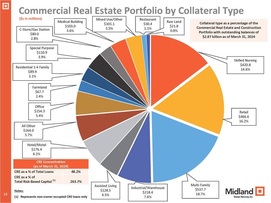 17 17 Industries as a percentage of Commercial, CRE and Equipment Finance Loans and Leases with outstanding balances of $4.74 billion as of March 31, 2024 ($s in millions) RE/Rental & Leasing $1,673.6 35.3% All Others $567.5 12.0% Skilled Nursing $417.0 8.8% Construction - General $314.3 6.6% Manufacturing $234.2 4.9% Assisted Living $104.1 2.2% Trans./Ground Passenger $187.9 4.0% Accommodation & Food Svcs $238.8 5.0% Ag., Forestry, & Fishing $141.9 3.0% General Freight Trucking $191.9 4.0% Wholesale Trade $62.3 1.3% Retail Trade $168.4 3.5% Other Services $102.6 2.2% Commercial Loans and Leases by Industry Health Care $70.5 1.5% Finance and Insurance $267.7 5.6%