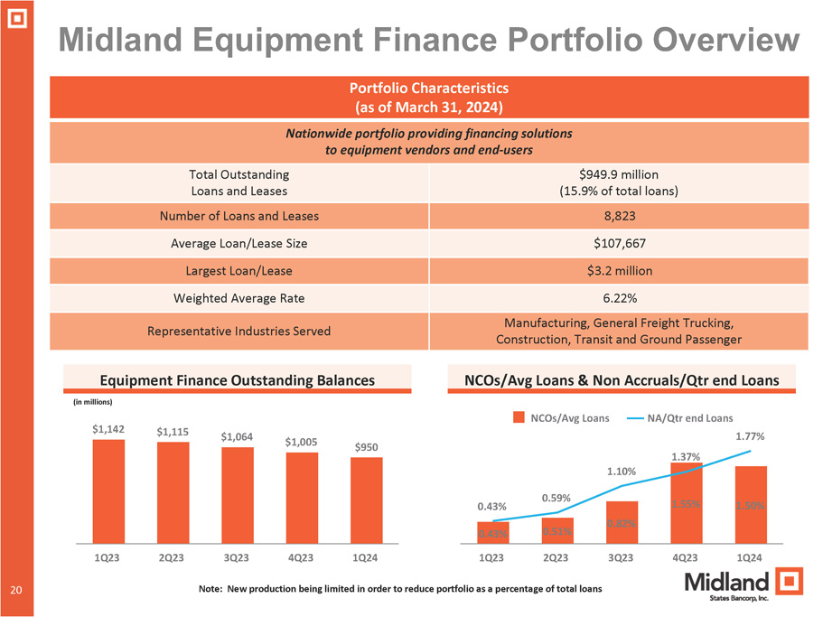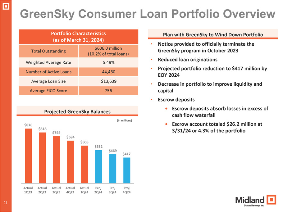 20 Midland Equipment Finance Portfolio Overview 20 Portfolio Characteristics (as of March 31, 2024) Nationwide portfolio providing financing solutions to equipment vendors and end - users $949.9 million (15.9% of total loans) Total Outstanding Loans and Leases 8,823 Number of Loans and Leases $107,667 Average Loan/Lease Size $3.2 million Largest Loan/Lease 6.22% Weighted Average Rate Manufacturing, General Freight Trucking, Construction, Transit and Ground Passenger Representative Industries Served Equipment Finance Outstanding Balances (in millions) $1,142 $1,115 $1,064 $1,005 $950 1Q23 2Q23 3Q23 4Q23 1Q24 1Q23 2Q23 Note: New production being limited in order to reduce portfolio as a percentage of total loans 0.43% 0.51% 0.82% 1.55% 1.50% 0.43% 0.59% 1.10% 1.37% 1.77% NCOs/Avg Loans & Non Accruals/Qtr end Loans NCOs/Avg Loans NA/Qtr end Loans 3Q23 4Q23 1Q24