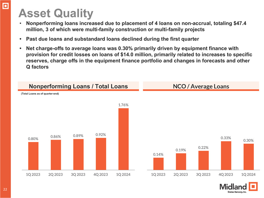 Asset Quality • Nonperforming loans increased due to placement of 4 loans on non - accrual, totaling $47.4 million, 3 of which were multi - family construction or multi - family projects • Past due loans and substandard loans declined during the first quarter • Net charge - offs to average loans was 0.30% primarily driven by equipment finance with provision for credit losses on loans of $14.0 million, primarily related to increases to specific reserves, charge offs in the equipment finance portfolio and changes in forecasts and other Q factors Nonperforming Loans / Total Loans (Total Loans as of quarter - end) NCO / Average Loans 0.80% 0.86% 0.89% 0.92% 1.76% 1Q 2023 2Q 2023 3Q 2023 4Q 2023 1Q 2024 0.14% 21 22 0.19% 0.22% 0.33% 0.30% 1Q 2023 2Q 2023 3Q 2023 4Q 2023 1Q 2024