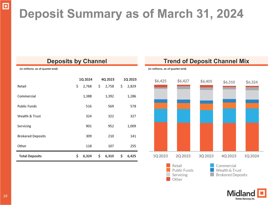 Deposit Summary as of March 31, 2024 Deposits by Channel (in millions, as of quarter - end) 1Q 2024 $ 2,768 4Q 2023 $ 2,758 1Q 2023 $ 2,829 Retail Commercial 1,388 1,392 1,286 Public Funds 516 569 578 Wealth & Trust 324 322 327 Servicing 901 952 1,009 Brokered Deposits 309 210 141 Other 118 107 255 Total Deposits $ 6,324 $ 6,310 $ 6,425 Trend of Deposit Channel Mix (in millions, as of quarter - end) $6,425 $6,427 $6,405 $6,310 $6,324 Commercial Retail Wealth & Trust Public Funds Brokered Deposits Servicing Other 1Q 2023 27 29 2Q 2023 3Q 2023 4Q 2023 1Q 2024