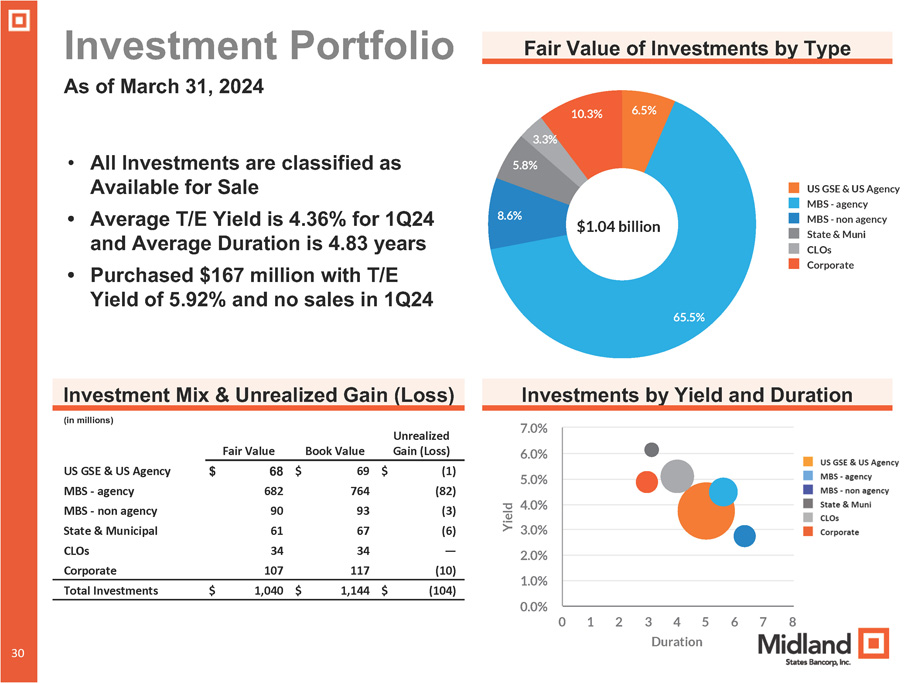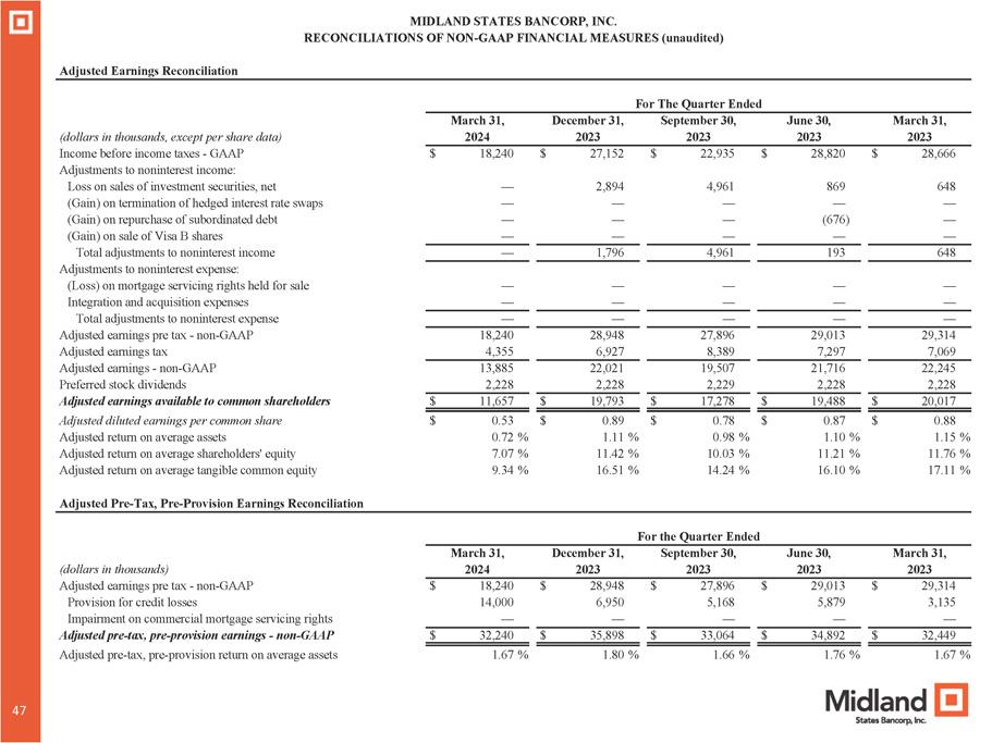 MIDLAND STATES BANCORP, INC. RECONCILIATIONS OF NON - GAAP FINANCIAL MEASURES (unaudited) Adjusted Earnings Reconciliation For The Quarter Ended March 31, 2023 June 30, 2023 September 30, 2023 December 31, 2023 March 31, 2024 (dollars in thousands, except per share data) $ 28,666 648 $ 28,820 869 $ 22,935 4,961 $ 27,152 2,894 $ 18,240 — Income before income taxes - GAAP Adjustments to noninterest income: Loss on sales of investment securities, net — — — — — (Gain) on termination of hedged interest rate swaps — (676) — — — (Gain) on repurchase of subordinated debt — — — — — (Gain) on sale of Visa B shares 648 193 4,961 1,796 — Total adjustments to noninterest income — — — — — Adjustments to noninterest expense: (Loss) on mortgage servicing rights held for sale — — — — — Integration and acquisition expenses — — — — — Total adjustments to noninterest expense 29,314 29,013 27,896 28,948 18,240 Adjusted earnings pre tax - non - GAAP 7,069 7,297 8,389 6,927 4,355 Adjusted earnings tax 22,245 21,716 19,507 22,021 13,885 Adjusted earnings - non - GAAP 2,228 2,228 2,229 2,228 2,228 Preferred stock dividends $ 20,017 $ 19,488 $ 17,278 $ 19,793 $ 11,657 Adjusted earnings available to common shareholders $ 0.88 $ 0.87 $ 0.78 $ 0.89 $ 0.53 Adjusted diluted earnings per common share 1.15 % 1.10 % 0.98 % 1.11 % 0.72 % Adjusted return on average assets 11.76 % 11.21 % 10.03 % 11.42 % 7.07 % Adjusted return on average shareholders' equity 17.11 % 16.10 % 14.24 % 16.51 % 9.34 % Adjusted return on average tangible common equity Adjusted Pre - Tax, Pre - Provision Earnings Reconciliation For the Quarter Ended March 31, June 30, September 30, December 31, March 31, 2023 2023 2023 2023 2024 (dollars in thousands) $ 29,314 $ 29,013 $ 27,896 $ 28,948 $ 18,240 Adjusted earnings pre tax - non - GAAP 3,135 5,879 5,168 6,950 14,000 Provision for credit losses — — — — — Impairment on commercial mortgage servicing rights $ 32,449 $ 34,892 $ 33,064 $ 35,898 $ 32,240 Adjusted pre - tax, pre - provision earnings - non - GAAP 1.67 % 1.76 % 1.66 % 1.80 % 1.67 % Adjusted pre - tax, pre - provision return on average assets 47 47