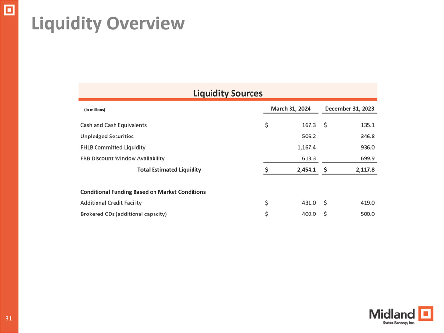 Liquidity Overview Liquidity Sources (in millions) March 31, 2024 December 31, 2023 $ 135.1 $ 167.3 Cash and Cash Equivalents 346.8 506.2 Unpledged Securities 936.0 1,167.4 FHLB Committed Liquidity 699.9 613.3 FRB Discount Window Availability $ 2,117.8 $ 2,454.1 Total Estimated Liquidity $ 419.0 $ 431.0 Conditional Funding Based on Market Conditions Additional Credit Facility $ 500.0 $ 400.0 Brokered CDs (additional capacity) 31 31
