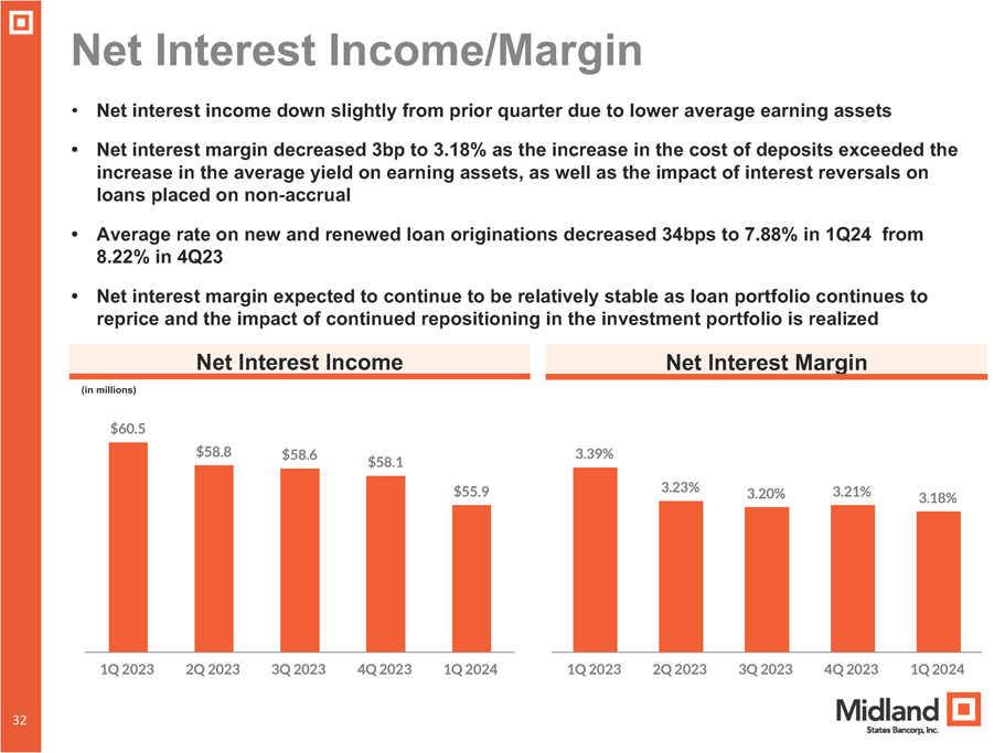 3.39% 3.23% 3.20% 3.21% 3.18% 1Q 2023 2Q 2023 3Q 2023 4Q 2023 1Q 2024 (in millions) $60.5 $58.8 $58.6 $58.1 $55.9 1Q 2023 2Q 2023 3Q 2023 4Q 2023 1Q 2024 Net Interest Income/Margin • Net interest income down slightly from prior quarter due to lower average earning assets • Net interest margin decreased 3bp to 3.18% as the increase in the cost of deposits exceeded the increase in the average yield on earning assets, as well as the impact of interest reversals on loans placed on non - accrual • Average rate on new and renewed loan originations decreased 34bps to 7.88% in 1Q24 from 8.22% in 4Q23 • Net interest margin expected to continue to be relatively stable as loan portfolio continues to reprice and the impact of continued repositioning in the investment portfolio is realized Net Interest Income Net Interest Margin 31 32