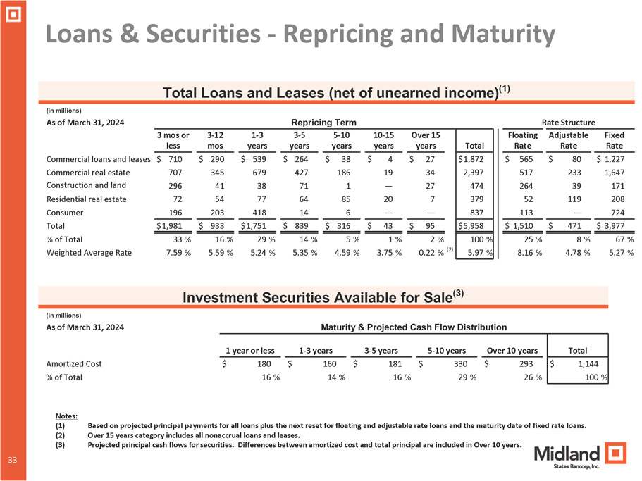 Loans & Securities - Repricing and Maturity Total Over 15 years 10 - 15 years 5 - 10 years 3 - 5 years 1 - 3 years 3 - 12 mos 3 mos or less $1,872 $ 27 $ 4 $ 38 $ 264 $ 539 $ 290 $ 710 2,397 34 19 186 427 679 345 707 474 27 — 1 71 38 41 296 379 7 20 85 64 77 54 72 837 — — 6 14 418 203 196 $5,958 $ 95 $ 43 $ 316 $ 839 $1,751 $ 933 $1,981 100 % 2 % 1 % 5 % 14 % 29 % 16 % 33 % 5.97 % (2) 0.22 % 3.75 % 4.59 % 5.35 % 5.24 % 5.59 % 7.59 % Total Loans and Leases (net of unearned income) (1) (in millions) Rate Structure Repricing Term As of March 31, 2024 Fixed Rate Adjustable Rate Floating Rate $ 1,227 $ 80 $ 565 Commercial loans and leases 1,647 233 517 Commercial real estate 171 39 264 Construction and land 208 119 52 Residential real estate 724 — 113 Consumer $ 3,977 $ 471 $ 1,510 Total 67 % 8 % 25 % % of Total 5.27 % 4.78 % 8.16 % Weighted Average Rate Investment Securities Available for Sale (3) (in millions) Maturity & Projected Cash Flow Distribution As of March 31, 2024 Amortized Cost % of Total Total Over 10 years 5 - 10 years 3 - 5 years 1 - 3 years 1 year or less $ 1,144 $ 293 $ 330 $ 181 $ 160 $ 180 100 % 26 % 29 % 16 % 14 % 16 % 31 33 Notes: (1) (2) (3) Based on projected principal payments for all loans plus the next reset for floating and adjustable rate loans and the maturity date of fixed rate loans. Over 15 years category includes all nonaccrual loans and leases. Projected principal cash flows for securities. Differences between amortized cost and total principal are included in Over 10 years.