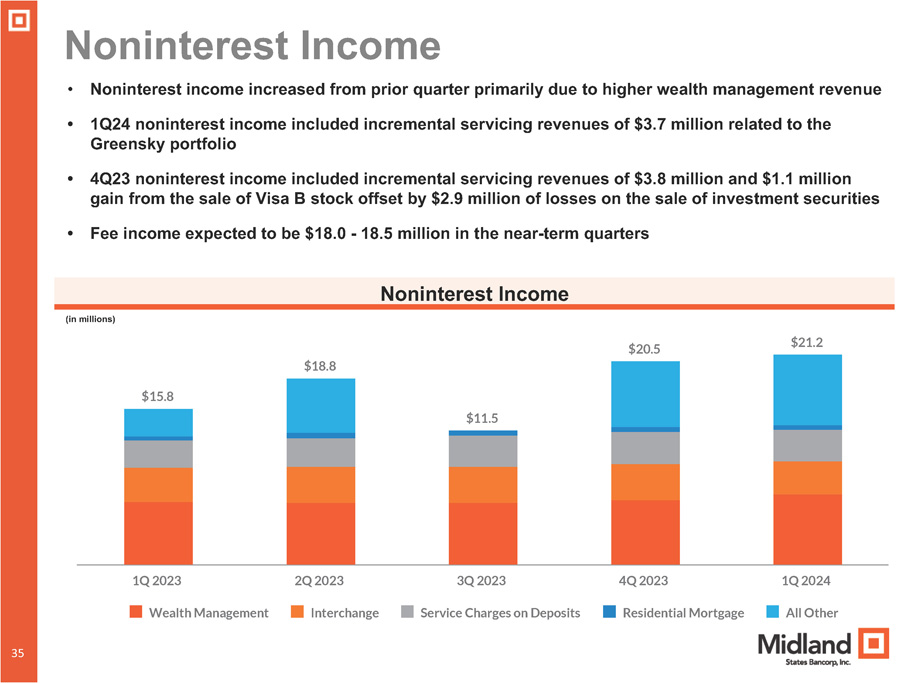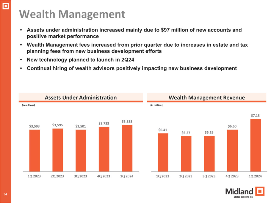 Wealth Management Assets Under Administration (in millions) Wealth Management Revenue (in millions) $3,503 $3,595 $3,501 $3,733 $3,888 1Q 2023 2Q 2023 3Q 2023 4Q 2023 1Q 2024 $6.41 31 34 $6.27 $6.29 $6.60 $7.13 1Q 2023 2Q 2023 3Q 2023 4Q 2023 1Q 2024 • Assets under administration increased mainly due to $97 million of new accounts and positive market performance • Wealth Management fees increased from prior quarter due to increases in estate and tax planning fees from new business development efforts • New technology planned to launch in 2Q24 • Continual hiring of wealth advisors positively impacting new business development