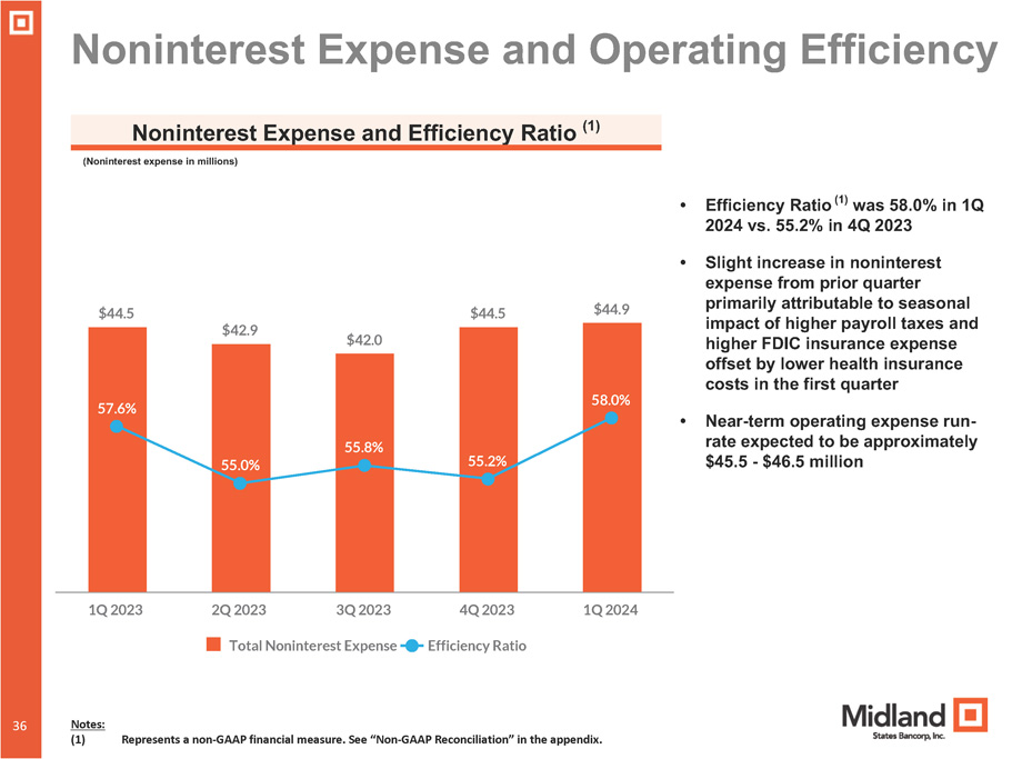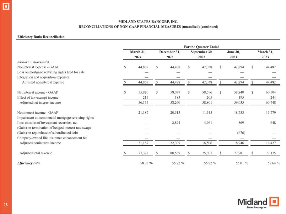 MIDLAND STATES BANCORP, INC. RECONCILIATIONS OF NON - GAAP FINANCIAL MEASURES (unaudited) (continued) Efficiency Ratio Reconciliation For the Quarter Ended March 31, June 30, September 30, December 31, March 31, 2023 2023 2023 2023 2024 $ 44,482 $ 42,894 $ 42,038 $ 44,488 $ 44,867 (dollars in thousands) Noninterest expense - GAAP — — — — — Loss on mortgage servicing rights held for sale — — — — — Integration and acquisition expenses $ 44,482 $ 42,894 $ 42,038 $ 44,488 $ 44,867 Adjusted noninterest expense $ 60,504 $ 58,840 $ 58,596 $ 58,077 $ 55,920 Net interest income - GAAP 244 195 205 183 215 Effect of tax - exempt income 60,748 59,035 58,801 58,260 56,135 Adjusted net interest income 15,779 18,753 11,545 20,513 21,187 Noninterest income - GAAP — — — — — Impairment on commercial mortgage servicing rights 648 869 4,961 2,894 — Loss on sales of investment securities, net — — — — — (Gain) on termination of hedged interest rate swaps — (676) — — — (Gain) on repurchase of subordinated debt — — — — — Company - owned life insurance enhancement fee 16,427 18,946 16,506 22,309 21,187 Adjusted noninterest income $ 77,175 $ 77,981 $ 75,307 $ 80,569 $ 77,322 Adjusted total revenue 57.64 % 55.01 % 55.82 % 55.22 % 58.03 % Efficiency ratio 47 48