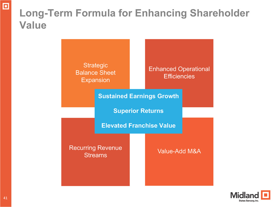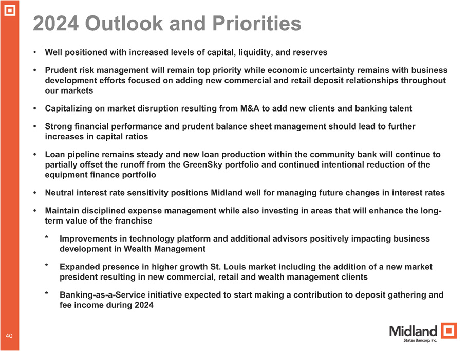 2024 Outlook and Priorities 37 40 • Well positioned with increased levels of capital, liquidity, and reserves • Prudent risk management will remain top priority while economic uncertainty remains with business development efforts focused on adding new commercial and retail deposit relationships throughout our markets • Capitalizing on market disruption resulting from M&A to add new clients and banking talent • Strong financial performance and prudent balance sheet management should lead to further increases in capital ratios • Loan pipeline remains steady and new loan production within the community bank will continue to partially offset the runoff from the GreenSky portfolio and continued intentional reduction of the equipment finance portfolio • Neutral interest rate sensitivity positions Midland well for managing future changes in interest rates • Maintain disciplined expense management while also investing in areas that will enhance the long - term value of the franchise * Improvements in technology platform and additional advisors positively impacting business development in Wealth Management * Expanded presence in higher growth St. Louis market including the addition of a new market president resulting in new commercial, retail and wealth management clients * Banking - as - a - Service initiative expected to start making a contribution to deposit gathering and fee income during 2024