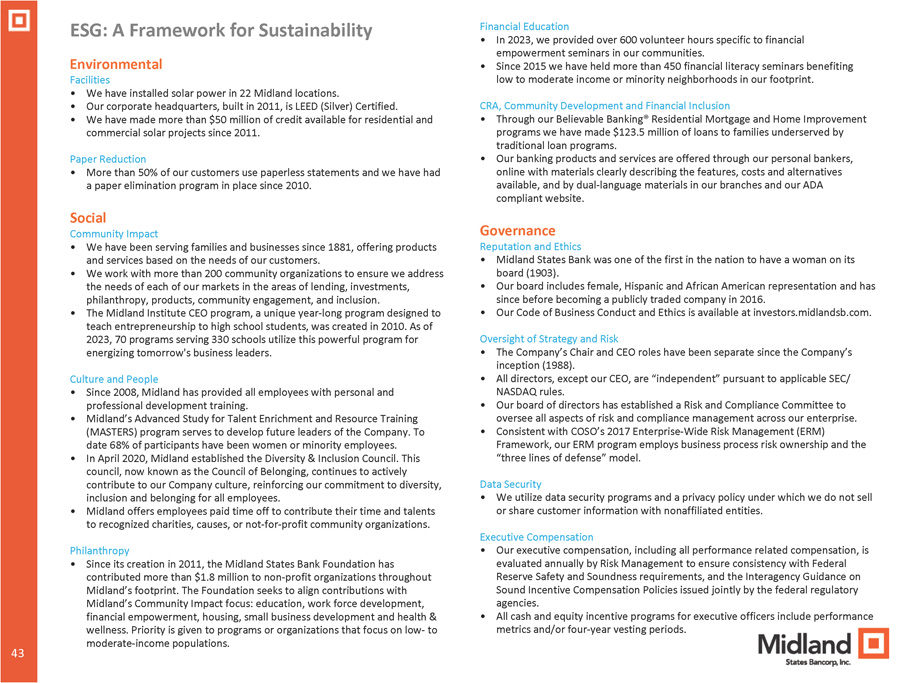 43 ESG: A Framework for Sustainability 43 Environmental Facilities • We have installed solar power in 22 Midland locations. • Our corporate headquarters, built in 2011, is LEED (Silver) Certified. • We have made more than $50 million of credit available for residential and commercial solar projects since 2011. Paper Reduction • More than 50% of our customers use paperless statements and we have had a paper elimination program in place since 2010. Social Community Impact • We have been serving families and businesses since 1881, offering products and services based on the needs of our customers. • We work with more than 200 community organizations to ensure we address the needs of each of our markets in the areas of lending, investments, philanthropy, products, community engagement, and inclusion. • The Midland Institute CEO program, a unique year - long program designed to teach entrepreneurship to high school students, was created in 2010. As of 2023, 70 programs serving 330 schools utilize this powerful program for energizing tomorrow's business leaders. Culture and People • Since 2008, Midland has provided all employees with personal and professional development training. • Midland’s Advanced Study for Talent Enrichment and Resource Training (MASTERS) program serves to develop future leaders of the Company. To date 68% of participants have been women or minority employees. • In April 2020, Midland established the Diversity & Inclusion Council. This council, now known as the Council of Belonging, continues to actively contribute to our Company culture, reinforcing our commitment to diversity, inclusion and belonging for all employees. • Midland offers employees paid time off to contribute their time and talents to recognized charities, causes, or not - for - profit community organizations. Philanthropy • Since its creation in 2011, the Midland States Bank Foundation has contributed more than $1.8 million to non - profit organizations throughout Midland’s footprint. The Foundation seeks to align contributions with Midland’s Community Impact focus: education, work force development, financial empowerment, housing, small business development and health & wellness. Priority is given to programs or organizations that focus on low - to moderate - income populations. Financial Education • In 2023, we provided over 600 volunteer hours specific to financial empowerment seminars in our communities. • Since 2015 we have held more than 450 financial literacy seminars benefiting low to moderate income or minority neighborhoods in our footprint. CRA, Community Development and Financial Inclusion • Through our Believable Banking® Residential Mortgage and Home Improvement programs we have made $123.5 million of loans to families underserved by traditional loan programs. • Our banking products and services are offered through our personal bankers, online with materials clearly describing the features, costs and alternatives available, and by dual - language materials in our branches and our ADA compliant website. Governance Reputation and Ethics • Midland States Bank was one of the first in the nation to have a woman on its board (1903). • Our board includes female, Hispanic and African American representation and has since before becoming a publicly traded company in 2016. • Our Code of Business Conduct and Ethics is available at investors.midlandsb.com. Oversight of Strategy and Risk • The Company’s Chair and CEO roles have been separate since the Company’s inception (1988). • All directors, except our CEO, are “independent” pursuant to applicable SEC/ NASDAQ rules. • Our board of directors has established a Risk and Compliance Committee to oversee all aspects of risk and compliance management across our enterprise. • Consistent with COSO’s 2017 Enterprise - Wide Risk Management (ERM) Framework, our ERM program employs business process risk ownership and the “three lines of defense” model. Data Security • We utilize data security programs and a privacy policy under which we do not sell or share customer information with nonaffiliated entities. Executive Compensation • Our executive compensation, including all performance related compensation, is evaluated annually by Risk Management to ensure consistency with Federal Reserve Safety and Soundness requirements, and the Interagency Guidance on Sound Incentive Compensation Policies issued jointly by the federal regulatory agencies. • All cash and equity incentive programs for executive officers include performance metrics and/or four - year vesting periods.