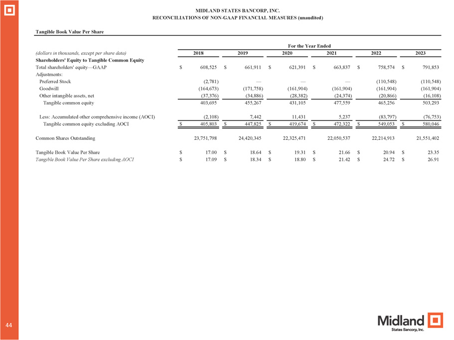 MIDLAND STATES BANCORP, INC. RECONCILIATIONS OF NON - GAAP FINANCIAL MEASURES (unaudited) Tangible Book Value Per Share For the Year Ended 2023 2022 2021 2020 2019 2018 (dollars in thousands, except per share data) $ 791,853 $ 758,574 $ 663,837 $ 621,391 $ 661,911 $ 608,525 Shareholders' Equity to Tangible Common Equity Total shareholders' equity — GAAP (110,548) (110,548) — — — (2,781) Adjustments: Preferred Stock (161,904) (161,904) (161,904) (161,904) (171,758) (164,673) Goodwill (16,108) (20,866) (24,374) (28,382) (34,886) (37,376) Other intangible assets, net 503,293 465,256 477,559 431,105 455,267 403,695 Tangible common equity (76,753) (83,797) 5,237 11,431 7,442 (2,108) Less: Accumulated other comprehensive income (AOCI) $ 580,046 $ 549,053 $ 472,322 $ 419,674 $ 447,825 $ 405,803 Tangible common equity excluding AOCI 21,551,402 22,214,913 22,050,537 22,325,471 24,420,345 23,751,798 Common Shares Outstanding $ 23.35 $ 20.94 $ 21.66 $ 19.31 $ 18.64 $ 17.00 Tangible Book Value Per Share $ 26.91 $ 24.72 $ 21.42 $ 18.80 $ 18.34 $ 17.09 Tangible Book Value Per Share excluding AOCI 44 44