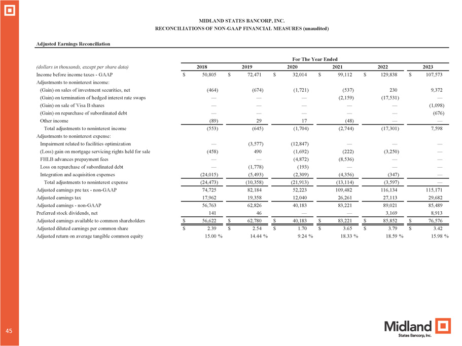 MIDLAND STATES BANCORP, INC. RECONCILIATIONS OF NON - GAAP FINANCIAL MEASURES (unaudited) Adjusted Earnings Reconciliation For The Year Ended 2023 2022 2021 2020 2019 2018 (dollars in thousands, except per share data) $ 107,573 $ 129,838 $ 99,112 $ 32,014 $ 72,471 $ 50,805 Income before income taxes - GAAP Adjustments to noninterest income: 9,372 230 (537) (1,721) (674) (464) (Gain) on sales of investment securities, net — (17,531) (2,159) — — — (Gain) on termination of hedged interest rate swaps (1,098) — — — — — (Gain) on sale of Visa B shares (676) — — — — — (Gain) on repurchase of subordinated debt — — (48) 17 29 (89) Other income 7,598 (17,301) (2,744) (1,704) (645) (553) Total adjustments to noninterest income Adjustments to noninterest expense: — — — (12,847) (3,577) — Impairment related to facilities optimization — (3,250) (222) (1,692) 490 (458) (Loss) gain on mortgage servicing rights held for sale — — (8,536) (4,872) — — FHLB advances prepayment fees — — — (193) (1,778) — Loss on repurchase of subordinated debt — (347) (4,356) (2,309) (5,493) (24,015) Integration and acquisition expenses — (3,597) (13,114) (21,913) (10,358) (24,473) Total adjustments to noninterest expense 115,171 116,134 109,482 52,223 82,184 74,725 Adjusted earnings pre tax - non - GAAP 29,682 27,113 26,261 12,040 19,358 17,962 Adjusted earnings tax 85,489 89,021 83,221 40,183 62,826 56,763 Adjusted earnings - non - GAAP 8,913 3,169 — — 46 141 Preferred stock dividends, net $ 76,576 $ 85,852 $ 83,221 $ 40,183 $ 62,780 $ 56,622 Adjusted earnings available to common shareholders $ 3.42 $ 3.79 $ 3.65 $ 1.70 $ 2.54 $ 2.39 Adjusted diluted earnings per common share 15.98 % 18.59 % 18.33 % 9.24 % 14.44 % 15.00 % Adjusted return on average tangible common equity 44 45