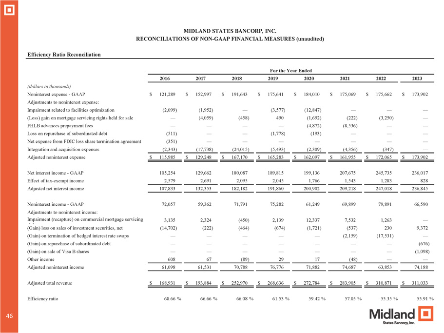 MIDLAND STATES BANCORP, INC. RECONCILIATIONS OF NON - GAAP FINANCIAL MEASURES (unaudited) Efficiency Ratio Reconciliation For the Year Ended 2023 2022 2021 2020 2019 2018 2017 2016 (dollars in thousands) $ 173,902 $ 175,662 $ 175,069 $ 184,010 $ 175,641 $ 191,643 $ 152,997 $ 121,289 Noninterest expense - GAAP Adjustments to noninterest expense: — — — (12,847) (3,577) — (1,952) (2,099) Impairment related to facilities optimization — (3,250) (222) (1,692) 490 (458) (4,059) — (Loss) gain on mortgage servicing rights held for sale — — (8,536) (4,872) — — — — FHLB advances prepayment fees — — — (193) (1,778) — — (511) Loss on repurchase of subordinated debt — — — — — — — (351) Net expense from FDIC loss share termination agreement — (347) (4,356) (2,309) (5,493) (24,015) (17,738) (2,343) Integration and acquisition expenses $ 173,902 $ 115,985 $ 129,248 $ 167,170 $ 165,283 $ 162,097 $ 161,955 $ 172,065 Adjusted noninterest expense 236,017 245,735 207,675 199,136 189,815 180,087 129,662 105,254 Net interest income - GAAP 828 1,283 1,543 1,766 2,045 2,095 2,691 2,579 Effect of tax - exempt income 236,845 247,018 209,218 200,902 191,860 182,182 132,353 107,833 Adjusted net interest income 66,590 79,891 69,899 61,249 75,282 71,791 59,362 72,057 Noninterest income - GAAP — 1,263 7,532 12,337 2,139 (450) 2,324 3,135 Adjustments to noninterest income: Impairment (recapture) on commercial mortgage servicing 9,372 230 (537) (1,721) (674) (464) (222) (14,702) (Gain) loss on sales of investment securities, net — (17,531) (2,159) — — — — — (Gain) on termination of hedged interest rate swaps (676) — — — — — — — (Gain) on repurchase of subordinated debt (1,098) — — — — — — — (Gain) on sale of Visa B shares — — (48) 17 29 (89) 67 608 Other income 74,188 63,853 74,687 71,882 76,776 70,788 61,531 61,098 Adjusted noninterest income $ 311,033 $ 310,871 $ 283,905 $ 272,784 $ 268,636 $ 252,970 $ 193,884 $ 168,931 Adjusted total revenue 55.91 % 55.35 % 57.05 % 59.42 % 61.53 % 66.08 % 66.66 % 68.66 % Efficiency ratio 46