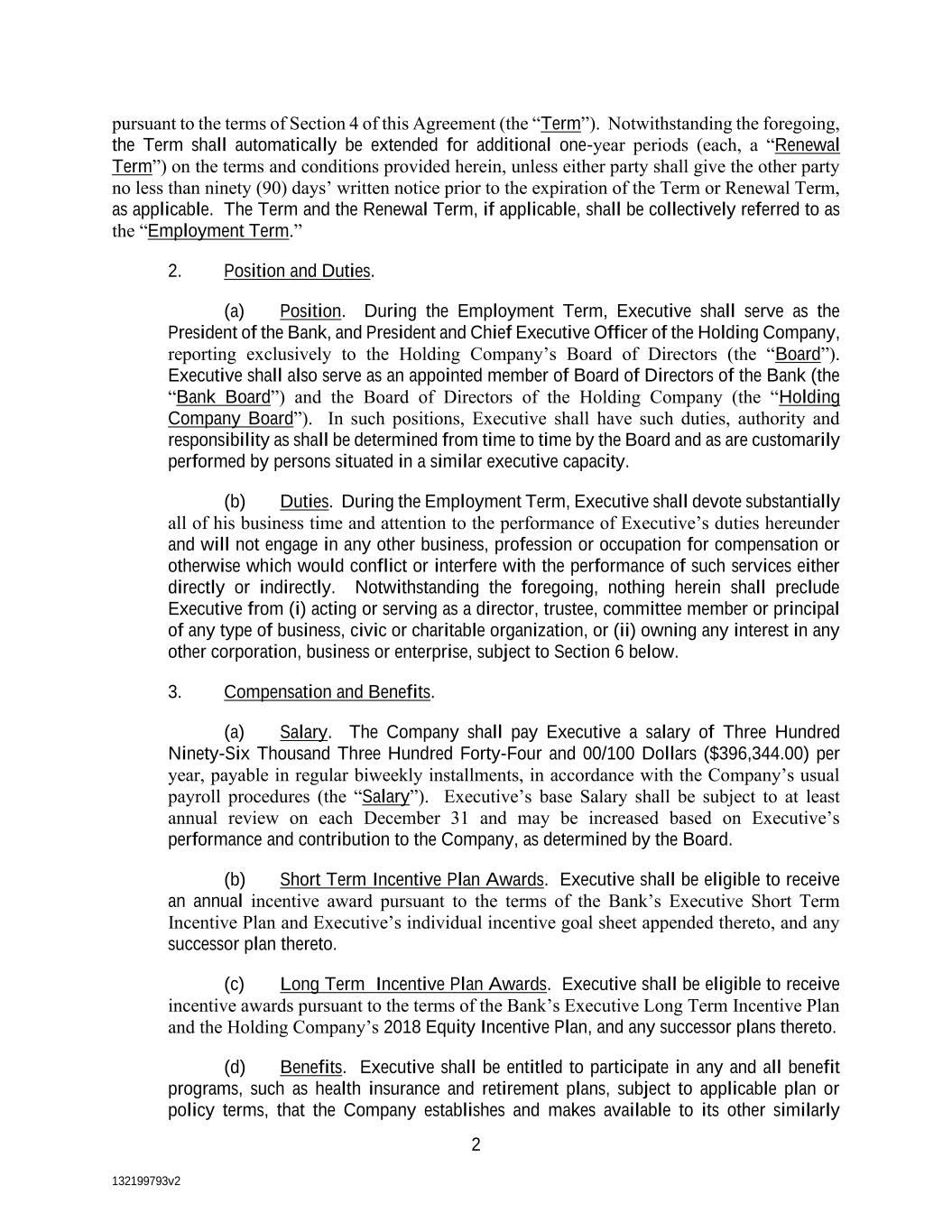 132199793v2 2 pursuant to the terms of Section 4 of this Agreement (the “Term”). Notwithstanding the foregoing, the Term shall automatically be extended for additional one-year periods (each, a “Renewal Term”) on the terms and conditions provided herein, unless either party shall give the other party no less than ninety (90) days’ written notice prior to the expiration of the Term or Renewal Term, as applicable. The Term and the Renewal Term, if applicable, shall be collectively referred to as the “Employment Term.” 2. Position and Duties. (a) Position. During the Employment Term, Executive shall serve as the President of the Bank, and President and Chief Executive Officer of the Holding Company, reporting exclusively to the Holding Company’s Board of Directors (the “Board”). Executive shall also serve as an appointed member of Board of Directors of the Bank (the “Bank Board”) and the Board of Directors of the Holding Company (the “Holding Company Board”). In such positions, Executive shall have such duties, authority and responsibility as shall be determined from time to time by the Board and as are customarily performed by persons situated in a similar executive capacity. (b) Duties. During the Employment Term, Executive shall devote substantially all of his business time and attention to the performance of Executive’s duties hereunder and will not engage in any other business, profession or occupation for compensation or otherwise which would conflict or interfere with the performance of such services either directly or indirectly. Notwithstanding the foregoing, nothing herein shall preclude Executive from (i) acting or serving as a director, trustee, committee member or principal of any type of business, civic or charitable organization, or (ii) owning any interest in any other corporation, business or enterprise, subject to Section 6 below. 3. Compensation and Benefits. (a) Salary. The Company shall pay Executive a salary of Three Hundred Ninety-Six Thousand Three Hundred Forty-Four and 00/100 Dollars ($396,344.00) per year, payable in regular biweekly installments, in accordance with the Company’s usual payroll procedures (the “Salary”). Executive’s base Salary shall be subject to at least annual review on each December 31 and may be increased based on Executive’s performance and contribution to the Company, as determined by the Board. (b) Short Term Incentive Plan Awards. Executive shall be eligible to receive an annual incentive award pursuant to the terms of the Bank’s Executive Short Term Incentive Plan and Executive’s individual incentive goal sheet appended thereto, and any successor plan thereto. (c) Long Term Incentive Plan Awards. Executive shall be eligible to receive incentive awards pursuant to the terms of the Bank’s Executive Long Term Incentive Plan and the Holding Company’s 2018 Equity Incentive Plan, and any successor plans thereto. (d) Benefits. Executive shall be entitled to participate in any and all benefit programs, such as health insurance and retirement plans, subject to applicable plan or policy terms, that the Company establishes and makes available to its other similarly