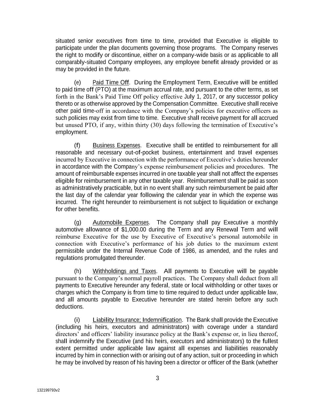 132199793v2 3 situated senior executives from time to time, provided that Executive is eligible to participate under the plan documents governing those programs. The Company reserves the right to modify or discontinue, either on a company-wide basis or as applicable to all comparably-situated Company employees, any employee benefit already provided or as may be provided in the future. (e) Paid Time Off. During the Employment Term, Executive will be entitled to paid time off (PTO) at the maximum accrual rate, and pursuant to the other terms, as set forth in the Bank’s Paid Time Off policy effective July 1, 2017, or any successor policy thereto or as otherwise approved by the Compensation Committee. Executive shall receive other paid time-off in accordance with the Company’s policies for executive officers as such policies may exist from time to time. Executive shall receive payment for all accrued but unused PTO, if any, within thirty (30) days following the termination of Executive’s employment. (f) Business Expenses. Executive shall be entitled to reimbursement for all reasonable and necessary out-of-pocket business, entertainment and travel expenses incurred by Executive in connection with the performance of Executive’s duties hereunder in accordance with the Company’s expense reimbursement policies and procedures. The amount of reimbursable expenses incurred in one taxable year shall not affect the expenses eligible for reimbursement in any other taxable year. Reimbursement shall be paid as soon as administratively practicable, but in no event shall any such reimbursement be paid after the last day of the calendar year following the calendar year in which the expense was incurred. The right hereunder to reimbursement is not subject to liquidation or exchange for other benefits. (g) Automobile Expenses. The Company shall pay Executive a monthly automotive allowance of $1,000.00 during the Term and any Renewal Term and will reimburse Executive for the use by Executive of Executive’s personal automobile in connection with Executive’s performance of his job duties to the maximum extent permissible under the Internal Revenue Code of 1986, as amended, and the rules and regulations promulgated thereunder. (h) Withholdings and Taxes. All payments to Executive will be payable pursuant to the Company’s normal payroll practices. The Company shall deduct from all payments to Executive hereunder any federal, state or local withholding or other taxes or charges which the Company is from time to time required to deduct under applicable law, and all amounts payable to Executive hereunder are stated herein before any such deductions. (i) Liability Insurance; Indemnification. The Bank shall provide the Executive (including his heirs, executors and administrators) with coverage under a standard directors’ and officers’ liability insurance policy at the Bank’s expense or, in lieu thereof, shall indemnify the Executive (and his heirs, executors and administrators) to the fullest extent permitted under applicable law against all expenses and liabilities reasonably incurred by him in connection with or arising out of any action, suit or proceeding in which he may be involved by reason of his having been a director or officer of the Bank (whether