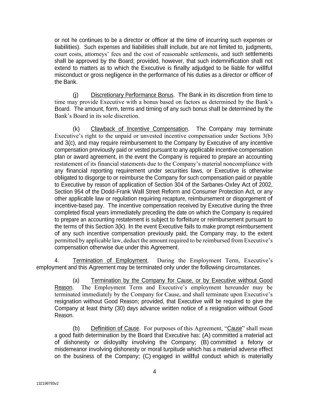 132199793v2 4 or not he continues to be a director or officer at the time of incurring such expenses or liabilities). Such expenses and liabilities shall include, but are not limited to, judgments, court costs, attorneys’ fees and the cost of reasonable settlements, and such settlements shall be approved by the Board; provided, however, that such indemnification shall not extend to matters as to which the Executive is finally adjudged to be liable for willful misconduct or gross negligence in the performance of his duties as a director or officer of the Bank. (j) Discretionary Performance Bonus. The Bank in its discretion from time to time may provide Executive with a bonus based on factors as determined by the Bank’s Board. The amount, form, terms and timing of any such bonus shall be determined by the Bank’s Board in its sole discretion. (k) Clawback of Incentive Compensation. The Company may terminate Executive’s right to the unpaid or unvested incentive compensation under Sections 3(b) and 3(c), and may require reimbursement to the Company by Executive of any incentive compensation previously paid or vested pursuant to any applicable incentive compensation plan or award agreement, in the event the Company is required to prepare an accounting restatement of its financial statements due to the Company’s material noncompliance with any financial reporting requirement under securities laws, or Executive is otherwise obligated to disgorge to or reimburse the Company for such compensation paid or payable to Executive by reason of application of Section 304 of the Sarbanes-Oxley Act of 2002, Section 954 of the Dodd-Frank Wall Street Reform and Consumer Protection Act, or any other applicable law or regulation requiring recapture, reimbursement or disgorgement of incentive-based pay. The incentive compensation received by Executive during the three completed fiscal years immediately preceding the date on which the Company is required to prepare an accounting restatement is subject to forfeiture or reimbursement pursuant to the terms of this Section 3(k). In the event Executive fails to make prompt reimbursement of any such incentive compensation previously paid, the Company may, to the extent permitted by applicable law, deduct the amount required to be reimbursed from Executive’s compensation otherwise due under this Agreement. 4. Termination of Employment. During the Employment Term, Executive’s employment and this Agreement may be terminated only under the following circumstances. (a) Termination by the Company for Cause, or by Executive without Good Reason. The Employment Term and Executive’s employment hereunder may be terminated immediately by the Company for Cause, and shall terminate upon Executive’s resignation without Good Reason; provided, that Executive will be required to give the Company at least thirty (30) days advance written notice of a resignation without Good Reason. (b) Definition of Cause. For purposes of this Agreement, “Cause” shall mean a good faith determination by the Board that Executive has: (A) committed a material act of dishonesty or disloyalty involving the Company; (B) committed a felony or misdemeanor involving dishonesty or moral turpitude which has a material adverse effect on the business of the Company; (C) engaged in willful conduct which is materially