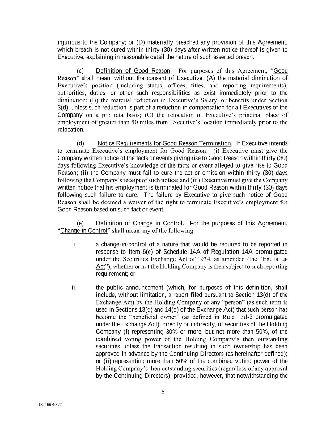 132199793v2 5 injurious to the Company; or (D) materially breached any provision of this Agreement, which breach is not cured within thirty (30) days after written notice thereof is given to Executive, explaining in reasonable detail the nature of such asserted breach. (c) Definition of Good Reason. For purposes of this Agreement, “Good Reason” shall mean, without the consent of Executive, (A) the material diminution of Executive’s position (including status, offices, titles, and reporting requirements), authorities, duties, or other such responsibilities as exist immediately prior to the diminution; (B) the material reduction in Executive’s Salary, or benefits under Section 3(d), unless such reduction is part of a reduction in compensation for all Executives of the Company on a pro rata basis; (C) the relocation of Executive’s principal place of employment of greater than 50 miles from Executive’s location immediately prior to the relocation. (d) Notice Requirements for Good Reason Termination. If Executive intends to terminate Executive’s employment for Good Reason: (i) Executive must give the Company written notice of the facts or events giving rise to Good Reason within thirty (30) days following Executive’s knowledge of the facts or event alleged to give rise to Good Reason; (ii) the Company must fail to cure the act or omission within thirty (30) days following the Company’s receipt of such notice; and (iii) Executive must give the Company written notice that his employment is terminated for Good Reason within thirty (30) days following such failure to cure. The failure by Executive to give such notice of Good Reason shall be deemed a waiver of the right to terminate Executive’s employment for Good Reason based on such fact or event. (e) Definition of Change in Control. For the purposes of this Agreement, “Change in Control” shall mean any of the following: i. a change-in-control of a nature that would be required to be reported in response to Item 6(e) of Schedule 14A of Regulation 14A promulgated under the Securities Exchange Act of 1934, as amended (the “Exchange Act”), whether or not the Holding Company is then subject to such reporting requirement; or ii. the public announcement (which, for purposes of this definition, shall include, without limitation, a report filed pursuant to Section 13(d) of the Exchange Act) by the Holding Company or any “person” (as such term is used in Sections 13(d) and 14(d) of the Exchange Act) that such person has become the “beneficial owner” (as defined in Rule 13d-3 promulgated under the Exchange Act), directly or indirectly, of securities of the Holding Company (i) representing 30% or more, but not more than 50%, of the combined voting power of the Holding Company’s then outstanding securities unless the transaction resulting in such ownership has been approved in advance by the Continuing Directors (as hereinafter defined); or (ii) representing more than 50% of the combined voting power of the Holding Company’s then outstanding securities (regardless of any approval by the Continuing Directors); provided, however, that notwithstanding the