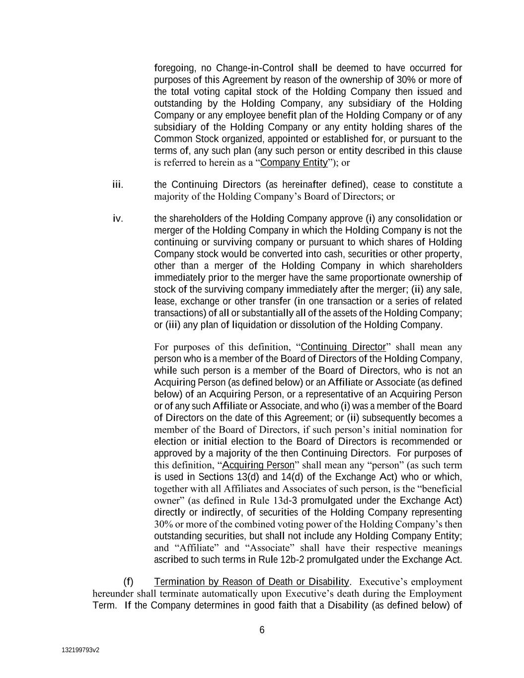 132199793v2 6 foregoing, no Change-in-Control shall be deemed to have occurred for purposes of this Agreement by reason of the ownership of 30% or more of the total voting capital stock of the Holding Company then issued and outstanding by the Holding Company, any subsidiary of the Holding Company or any employee benefit plan of the Holding Company or of any subsidiary of the Holding Company or any entity holding shares of the Common Stock organized, appointed or established for, or pursuant to the terms of, any such plan (any such person or entity described in this clause is referred to herein as a “Company Entity”); or iii. the Continuing Directors (as hereinafter defined), cease to constitute a majority of the Holding Company’s Board of Directors; or iv. the shareholders of the Holding Company approve (i) any consolidation or merger of the Holding Company in which the Holding Company is not the continuing or surviving company or pursuant to which shares of Holding Company stock would be converted into cash, securities or other property, other than a merger of the Holding Company in which shareholders immediately prior to the merger have the same proportionate ownership of stock of the surviving company immediately after the merger; (ii) any sale, lease, exchange or other transfer (in one transaction or a series of related transactions) of all or substantially all of the assets of the Holding Company; or (iii) any plan of liquidation or dissolution of the Holding Company. For purposes of this definition, “Continuing Director” shall mean any person who is a member of the Board of Directors of the Holding Company, while such person is a member of the Board of Directors, who is not an Acquiring Person (as defined below) or an Affiliate or Associate (as defined below) of an Acquiring Person, or a representative of an Acquiring Person or of any such Affiliate or Associate, and who (i) was a member of the Board of Directors on the date of this Agreement; or (ii) subsequently becomes a member of the Board of Directors, if such person’s initial nomination for election or initial election to the Board of Directors is recommended or approved by a majority of the then Continuing Directors. For purposes of this definition, “Acquiring Person” shall mean any “person” (as such term is used in Sections 13(d) and 14(d) of the Exchange Act) who or which, together with all Affiliates and Associates of such person, is the “beneficial owner” (as defined in Rule 13d-3 promulgated under the Exchange Act) directly or indirectly, of securities of the Holding Company representing 30% or more of the combined voting power of the Holding Company’s then outstanding securities, but shall not include any Holding Company Entity; and “Affiliate” and “Associate” shall have their respective meanings ascribed to such terms in Rule 12b-2 promulgated under the Exchange Act. (f) Termination by Reason of Death or Disability. Executive’s employment hereunder shall terminate automatically upon Executive’s death during the Employment Term. If the Company determines in good faith that a Disability (as defined below) of