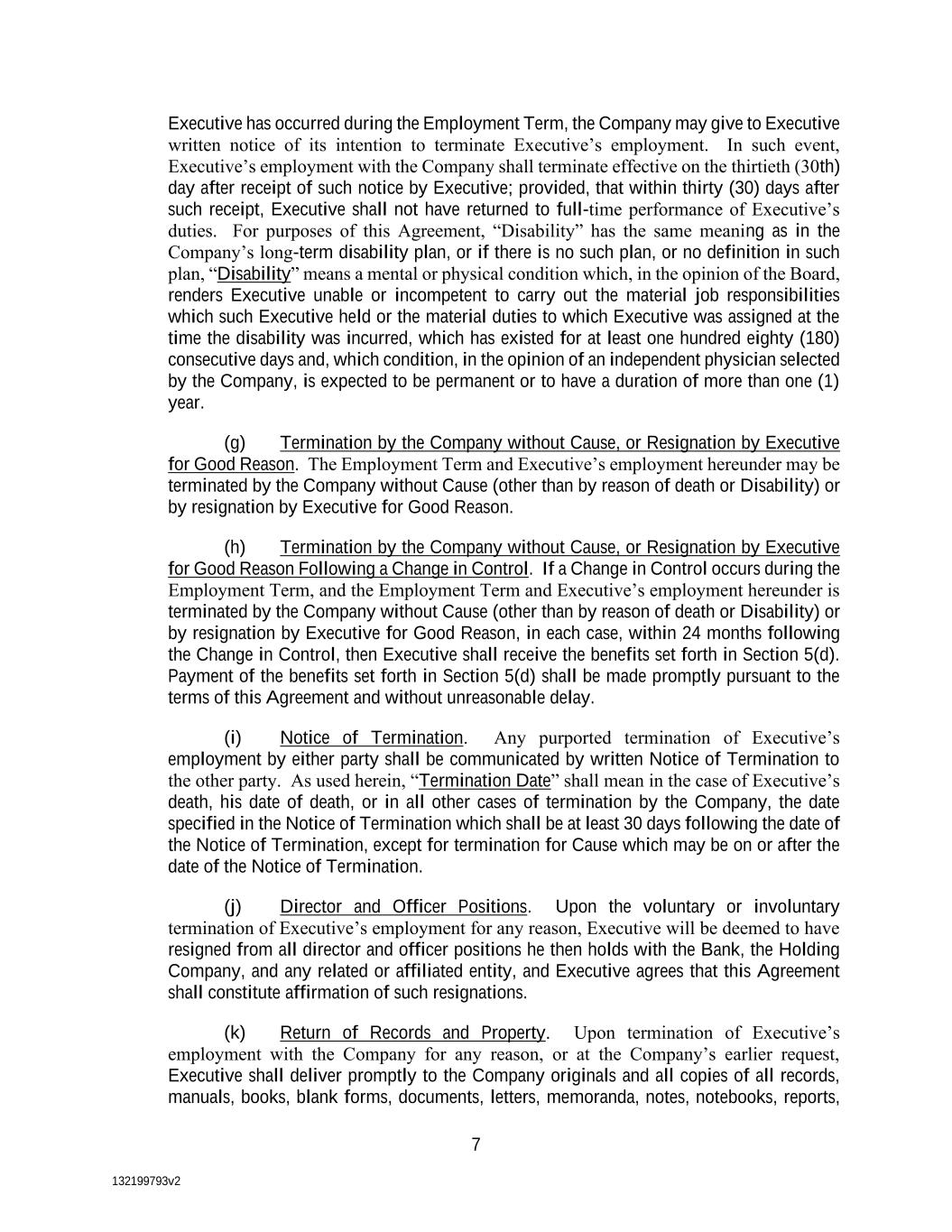 132199793v2 7 Executive has occurred during the Employment Term, the Company may give to Executive written notice of its intention to terminate Executive’s employment. In such event, Executive’s employment with the Company shall terminate effective on the thirtieth (30th) day after receipt of such notice by Executive; provided, that within thirty (30) days after such receipt, Executive shall not have returned to full-time performance of Executive’s duties. For purposes of this Agreement, “Disability” has the same meaning as in the Company’s long-term disability plan, or if there is no such plan, or no definition in such plan, “Disability” means a mental or physical condition which, in the opinion of the Board, renders Executive unable or incompetent to carry out the material job responsibilities which such Executive held or the material duties to which Executive was assigned at the time the disability was incurred, which has existed for at least one hundred eighty (180) consecutive days and, which condition, in the opinion of an independent physician selected by the Company, is expected to be permanent or to have a duration of more than one (1) year. (g) Termination by the Company without Cause, or Resignation by Executive for Good Reason. The Employment Term and Executive’s employment hereunder may be terminated by the Company without Cause (other than by reason of death or Disability) or by resignation by Executive for Good Reason. (h) Termination by the Company without Cause, or Resignation by Executive for Good Reason Following a Change in Control. If a Change in Control occurs during the Employment Term, and the Employment Term and Executive’s employment hereunder is terminated by the Company without Cause (other than by reason of death or Disability) or by resignation by Executive for Good Reason, in each case, within 24 months following the Change in Control, then Executive shall receive the benefits set forth in Section 5(d). Payment of the benefits set forth in Section 5(d) shall be made promptly pursuant to the terms of this Agreement and without unreasonable delay. (i) Notice of Termination. Any purported termination of Executive’s employment by either party shall be communicated by written Notice of Termination to the other party. As used herein, “Termination Date” shall mean in the case of Executive’s death, his date of death, or in all other cases of termination by the Company, the date specified in the Notice of Termination which shall be at least 30 days following the date of the Notice of Termination, except for termination for Cause which may be on or after the date of the Notice of Termination. (j) Director and Officer Positions. Upon the voluntary or involuntary termination of Executive’s employment for any reason, Executive will be deemed to have resigned from all director and officer positions he then holds with the Bank, the Holding Company, and any related or affiliated entity, and Executive agrees that this Agreement shall constitute affirmation of such resignations. (k) Return of Records and Property. Upon termination of Executive’s employment with the Company for any reason, or at the Company’s earlier request, Executive shall deliver promptly to the Company originals and all copies of all records, manuals, books, blank forms, documents, letters, memoranda, notes, notebooks, reports,