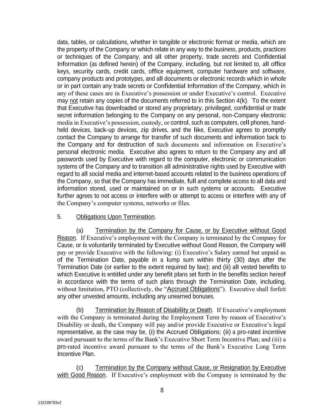132199793v2 8 data, tables, or calculations, whether in tangible or electronic format or media, which are the property of the Company or which relate in any way to the business, products, practices or techniques of the Company, and all other property, trade secrets and Confidential Information (as defined herein) of the Company, including, but not limited to, all office keys, security cards, credit cards, office equipment, computer hardware and software, company products and prototypes, and all documents or electronic records which in whole or in part contain any trade secrets or Confidential Information of the Company, which in any of these cases are in Executive’s possession or under Executive’s control. Executive may not retain any copies of the documents referred to in this Section 4(k). To the extent that Executive has downloaded or stored any proprietary, privileged, confidential or trade secret information belonging to the Company on any personal, non-Company electronic media in Executive’s possession, custody, or control, such as computers, cell phones, hand- held devices, back-up devices, zip drives, and the like, Executive agrees to promptly contact the Company to arrange for transfer of such documents and information back to the Company and for destruction of such documents and information on Executive’s personal electronic media. Executive also agrees to return to the Company any and all passwords used by Executive with regard to the computer, electronic or communication systems of the Company and to transition all administrative rights used by Executive with regard to all social media and internet-based accounts related to the business operations of the Company, so that the Company has immediate, full and complete access to all data and information stored, used or maintained on or in such systems or accounts. Executive further agrees to not access or interfere with or attempt to access or interfere with any of the Company’s computer systems, networks or files. 5. Obligations Upon Termination. (a) Termination by the Company for Cause, or by Executive without Good Reason. If Executive’s employment with the Company is terminated by the Company for Cause, or is voluntarily terminated by Executive without Good Reason, the Company will pay or provide Executive with the following: (i) Executive’s Salary earned but unpaid as of the Termination Date, payable in a lump sum within thirty (30) days after the Termination Date (or earlier to the extent required by law); and (ii) all vested benefits to which Executive is entitled under any benefit plans set forth in the benefits section hereof in accordance with the terms of such plans through the Termination Date, including, without limitation, PTO (collectively, the “Accrued Obligations”). Executive shall forfeit any other unvested amounts, including any unearned bonuses. (b) Termination by Reason of Disability or Death. If Executive’s employment with the Company is terminated during the Employment Term by reason of Executive’s Disability or death, the Company will pay and/or provide Executive or Executive’s legal representative, as the case may be, (i) the Accrued Obligations; (ii) a pro-rated incentive award pursuant to the terms of the Bank’s Executive Short Term Incentive Plan; and (iii) a pro-rated incentive award pursuant to the terms of the Bank’s Executive Long Term Incentive Plan. (c) Termination by the Company without Cause, or Resignation by Executive with Good Reason. If Executive’s employment with the Company is terminated by the