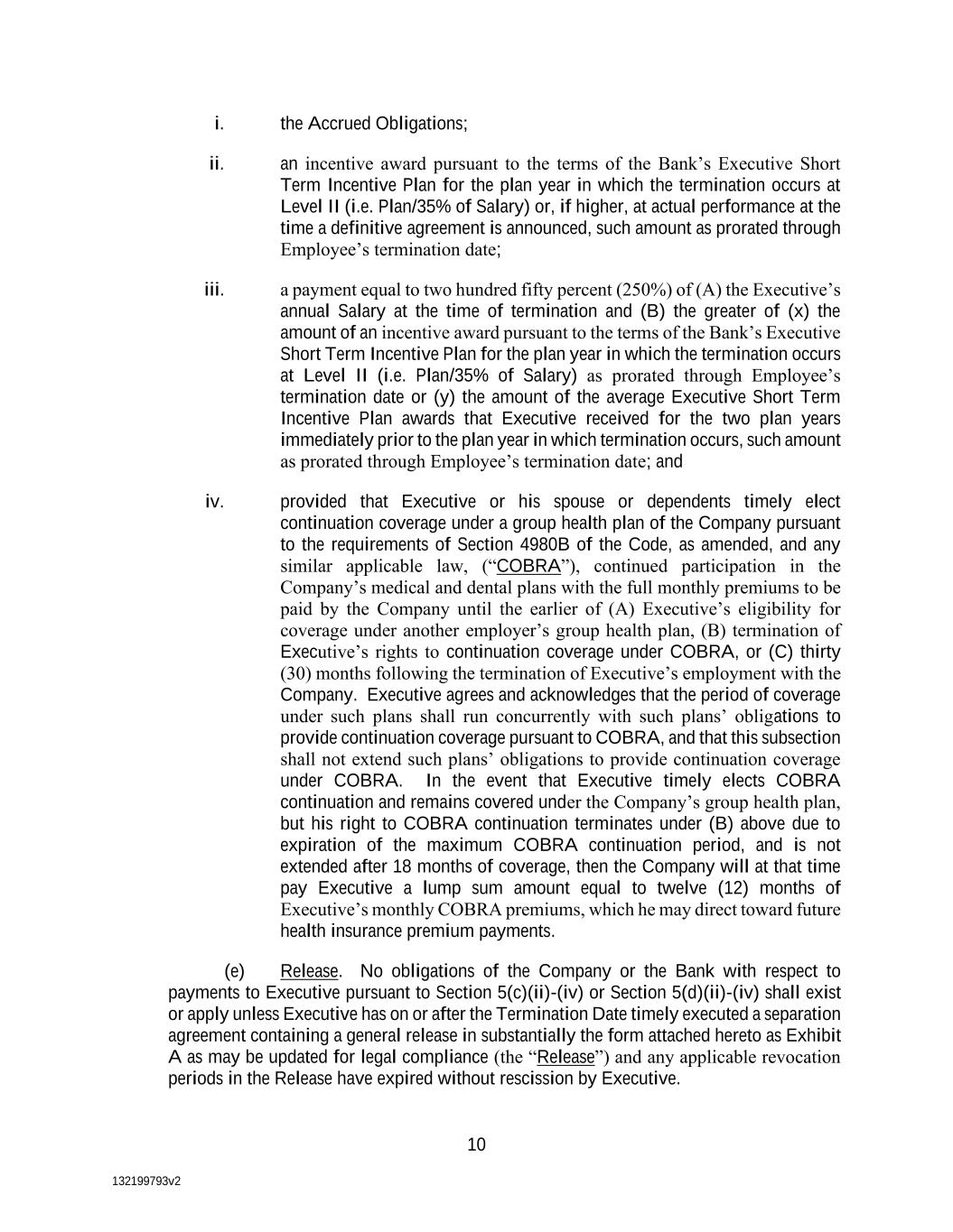 132199793v2 10 i. the Accrued Obligations; ii. an incentive award pursuant to the terms of the Bank’s Executive Short Term Incentive Plan for the plan year in which the termination occurs at Level II (i.e. Plan/35% of Salary) or, if higher, at actual performance at the time a definitive agreement is announced, such amount as prorated through Employee’s termination date; iii. a payment equal to two hundred fifty percent (250%) of (A) the Executive’s annual Salary at the time of termination and (B) the greater of (x) the amount of an incentive award pursuant to the terms of the Bank’s Executive Short Term Incentive Plan for the plan year in which the termination occurs at Level II (i.e. Plan/35% of Salary) as prorated through Employee’s termination date or (y) the amount of the average Executive Short Term Incentive Plan awards that Executive received for the two plan years immediately prior to the plan year in which termination occurs, such amount as prorated through Employee’s termination date; and iv. provided that Executive or his spouse or dependents timely elect continuation coverage under a group health plan of the Company pursuant to the requirements of Section 4980B of the Code, as amended, and any similar applicable law, (“COBRA”), continued participation in the Company’s medical and dental plans with the full monthly premiums to be paid by the Company until the earlier of (A) Executive’s eligibility for coverage under another employer’s group health plan, (B) termination of Executive’s rights to continuation coverage under COBRA, or (C) thirty (30) months following the termination of Executive’s employment with the Company. Executive agrees and acknowledges that the period of coverage under such plans shall run concurrently with such plans’ obligations to provide continuation coverage pursuant to COBRA, and that this subsection shall not extend such plans’ obligations to provide continuation coverage under COBRA. In the event that Executive timely elects COBRA continuation and remains covered under the Company’s group health plan, but his right to COBRA continuation terminates under (B) above due to expiration of the maximum COBRA continuation period, and is not extended after 18 months of coverage, then the Company will at that time pay Executive a lump sum amount equal to twelve (12) months of Executive’s monthly COBRA premiums, which he may direct toward future health insurance premium payments. (e) Release. No obligations of the Company or the Bank with respect to payments to Executive pursuant to Section 5(c)(ii)-(iv) or Section 5(d)(ii)-(iv) shall exist or apply unless Executive has on or after the Termination Date timely executed a separation agreement containing a general release in substantially the form attached hereto as Exhibit A as may be updated for legal compliance (the “Release”) and any applicable revocation periods in the Release have expired without rescission by Executive.
