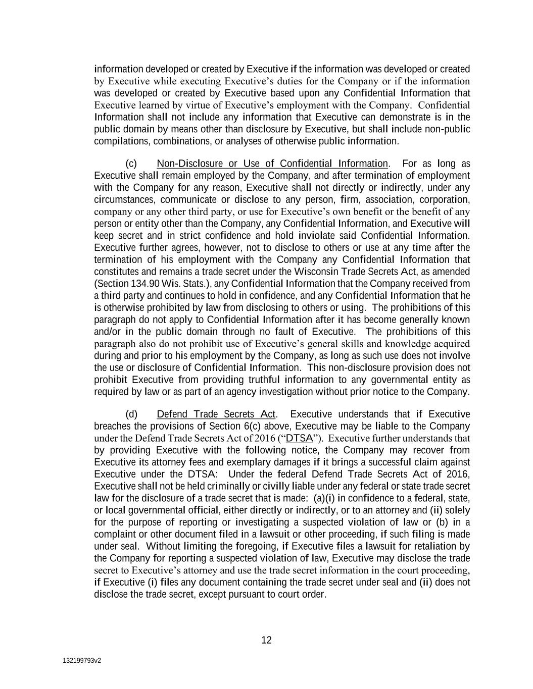 132199793v2 12 information developed or created by Executive if the information was developed or created by Executive while executing Executive’s duties for the Company or if the information was developed or created by Executive based upon any Confidential Information that Executive learned by virtue of Executive’s employment with the Company. Confidential Information shall not include any information that Executive can demonstrate is in the public domain by means other than disclosure by Executive, but shall include non-public compilations, combinations, or analyses of otherwise public information. (c) Non-Disclosure or Use of Confidential Information. For as long as Executive shall remain employed by the Company, and after termination of employment with the Company for any reason, Executive shall not directly or indirectly, under any circumstances, communicate or disclose to any person, firm, association, corporation, company or any other third party, or use for Executive’s own benefit or the benefit of any person or entity other than the Company, any Confidential Information, and Executive will keep secret and in strict confidence and hold inviolate said Confidential Information. Executive further agrees, however, not to disclose to others or use at any time after the termination of his employment with the Company any Confidential Information that constitutes and remains a trade secret under the Wisconsin Trade Secrets Act, as amended (Section 134.90 Wis. Stats.), any Confidential Information that the Company received from a third party and continues to hold in confidence, and any Confidential Information that he is otherwise prohibited by law from disclosing to others or using. The prohibitions of this paragraph do not apply to Confidential Information after it has become generally known and/or in the public domain through no fault of Executive. The prohibitions of this paragraph also do not prohibit use of Executive’s general skills and knowledge acquired during and prior to his employment by the Company, as long as such use does not involve the use or disclosure of Confidential Information. This non-disclosure provision does not prohibit Executive from providing truthful information to any governmental entity as required by law or as part of an agency investigation without prior notice to the Company. (d) Defend Trade Secrets Act. Executive understands that if Executive breaches the provisions of Section 6(c) above, Executive may be liable to the Company under the Defend Trade Secrets Act of 2016 (“DTSA”). Executive further understands that by providing Executive with the following notice, the Company may recover from Executive its attorney fees and exemplary damages if it brings a successful claim against Executive under the DTSA: Under the federal Defend Trade Secrets Act of 2016, Executive shall not be held criminally or civilly liable under any federal or state trade secret law for the disclosure of a trade secret that is made: (a)(i) in confidence to a federal, state, or local governmental official, either directly or indirectly, or to an attorney and (ii) solely for the purpose of reporting or investigating a suspected violation of law or (b) in a complaint or other document filed in a lawsuit or other proceeding, if such filing is made under seal. Without limiting the foregoing, if Executive files a lawsuit for retaliation by the Company for reporting a suspected violation of law, Executive may disclose the trade secret to Executive’s attorney and use the trade secret information in the court proceeding, if Executive (i) files any document containing the trade secret under seal and (ii) does not disclose the trade secret, except pursuant to court order.