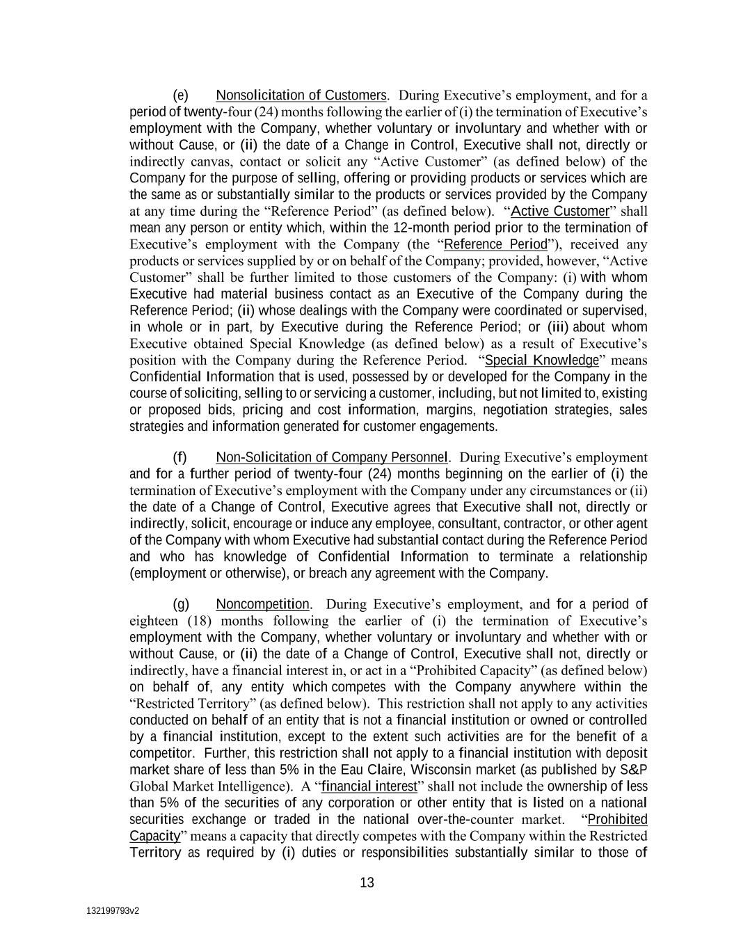 132199793v2 13 (e) Nonsolicitation of Customers. During Executive’s employment, and for a period of twenty-four (24) months following the earlier of (i) the termination of Executive’s employment with the Company, whether voluntary or involuntary and whether with or without Cause, or (ii) the date of a Change in Control, Executive shall not, directly or indirectly canvas, contact or solicit any “Active Customer” (as defined below) of the Company for the purpose of selling, offering or providing products or services which are the same as or substantially similar to the products or services provided by the Company at any time during the “Reference Period” (as defined below). “Active Customer” shall mean any person or entity which, within the 12-month period prior to the termination of Executive’s employment with the Company (the “Reference Period”), received any products or services supplied by or on behalf of the Company; provided, however, “Active Customer” shall be further limited to those customers of the Company: (i) with whom Executive had material business contact as an Executive of the Company during the Reference Period; (ii) whose dealings with the Company were coordinated or supervised, in whole or in part, by Executive during the Reference Period; or (iii) about whom Executive obtained Special Knowledge (as defined below) as a result of Executive’s position with the Company during the Reference Period. “Special Knowledge” means Confidential Information that is used, possessed by or developed for the Company in the course of soliciting, selling to or servicing a customer, including, but not limited to, existing or proposed bids, pricing and cost information, margins, negotiation strategies, sales strategies and information generated for customer engagements. (f) Non-Solicitation of Company Personnel. During Executive’s employment and for a further period of twenty-four (24) months beginning on the earlier of (i) the termination of Executive’s employment with the Company under any circumstances or (ii) the date of a Change of Control, Executive agrees that Executive shall not, directly or indirectly, solicit, encourage or induce any employee, consultant, contractor, or other agent of the Company with whom Executive had substantial contact during the Reference Period and who has knowledge of Confidential Information to terminate a relationship (employment or otherwise), or breach any agreement with the Company. (g) Noncompetition. During Executive’s employment, and for a period of eighteen (18) months following the earlier of (i) the termination of Executive’s employment with the Company, whether voluntary or involuntary and whether with or without Cause, or (ii) the date of a Change of Control, Executive shall not, directly or indirectly, have a financial interest in, or act in a “Prohibited Capacity” (as defined below) on behalf of, any entity which competes with the Company anywhere within the “Restricted Territory” (as defined below). This restriction shall not apply to any activities conducted on behalf of an entity that is not a financial institution or owned or controlled by a financial institution, except to the extent such activities are for the benefit of a competitor. Further, this restriction shall not apply to a financial institution with deposit market share of less than 5% in the Eau Claire, Wisconsin market (as published by S&P Global Market Intelligence). A “financial interest” shall not include the ownership of less than 5% of the securities of any corporation or other entity that is listed on a national securities exchange or traded in the national over-the-counter market. “Prohibited Capacity” means a capacity that directly competes with the Company within the Restricted Territory as required by (i) duties or responsibilities substantially similar to those of