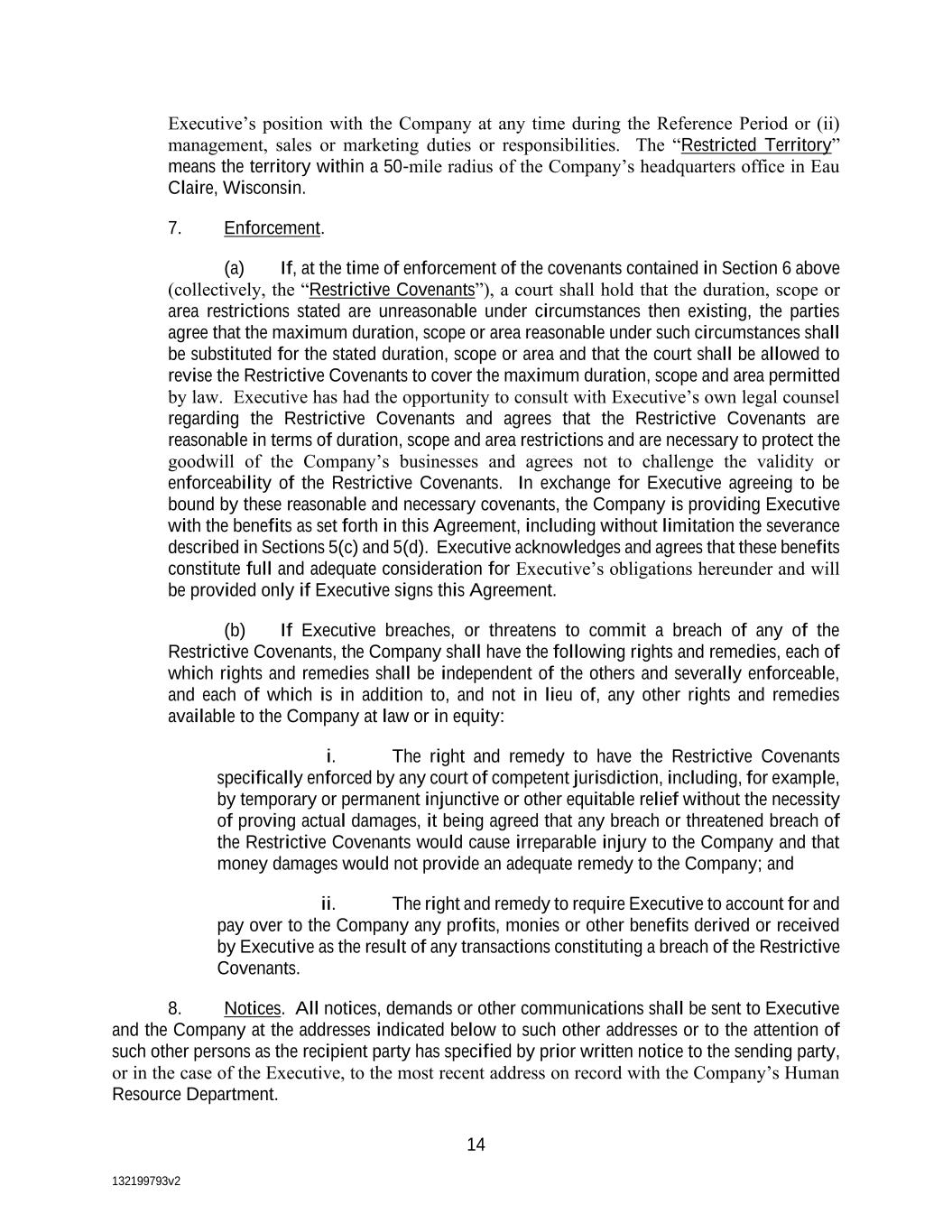 132199793v2 14 Executive’s position with the Company at any time during the Reference Period or (ii) management, sales or marketing duties or responsibilities. The “Restricted Territory” means the territory within a 50-mile radius of the Company’s headquarters office in Eau Claire, Wisconsin. 7. Enforcement. (a) If, at the time of enforcement of the covenants contained in Section 6 above (collectively, the “Restrictive Covenants”), a court shall hold that the duration, scope or area restrictions stated are unreasonable under circumstances then existing, the parties agree that the maximum duration, scope or area reasonable under such circumstances shall be substituted for the stated duration, scope or area and that the court shall be allowed to revise the Restrictive Covenants to cover the maximum duration, scope and area permitted by law. Executive has had the opportunity to consult with Executive’s own legal counsel regarding the Restrictive Covenants and agrees that the Restrictive Covenants are reasonable in terms of duration, scope and area restrictions and are necessary to protect the goodwill of the Company’s businesses and agrees not to challenge the validity or enforceability of the Restrictive Covenants. In exchange for Executive agreeing to be bound by these reasonable and necessary covenants, the Company is providing Executive with the benefits as set forth in this Agreement, including without limitation the severance described in Sections 5(c) and 5(d). Executive acknowledges and agrees that these benefits constitute full and adequate consideration for Executive’s obligations hereunder and will be provided only if Executive signs this Agreement. (b) If Executive breaches, or threatens to commit a breach of any of the Restrictive Covenants, the Company shall have the following rights and remedies, each of which rights and remedies shall be independent of the others and severally enforceable, and each of which is in addition to, and not in lieu of, any other rights and remedies available to the Company at law or in equity: i. The right and remedy to have the Restrictive Covenants specifically enforced by any court of competent jurisdiction, including, for example, by temporary or permanent injunctive or other equitable relief without the necessity of proving actual damages, it being agreed that any breach or threatened breach of the Restrictive Covenants would cause irreparable injury to the Company and that money damages would not provide an adequate remedy to the Company; and ii. The right and remedy to require Executive to account for and pay over to the Company any profits, monies or other benefits derived or received by Executive as the result of any transactions constituting a breach of the Restrictive Covenants. 8. Notices. All notices, demands or other communications shall be sent to Executive and the Company at the addresses indicated below to such other addresses or to the attention of such other persons as the recipient party has specified by prior written notice to the sending party, or in the case of the Executive, to the most recent address on record with the Company’s Human Resource Department.