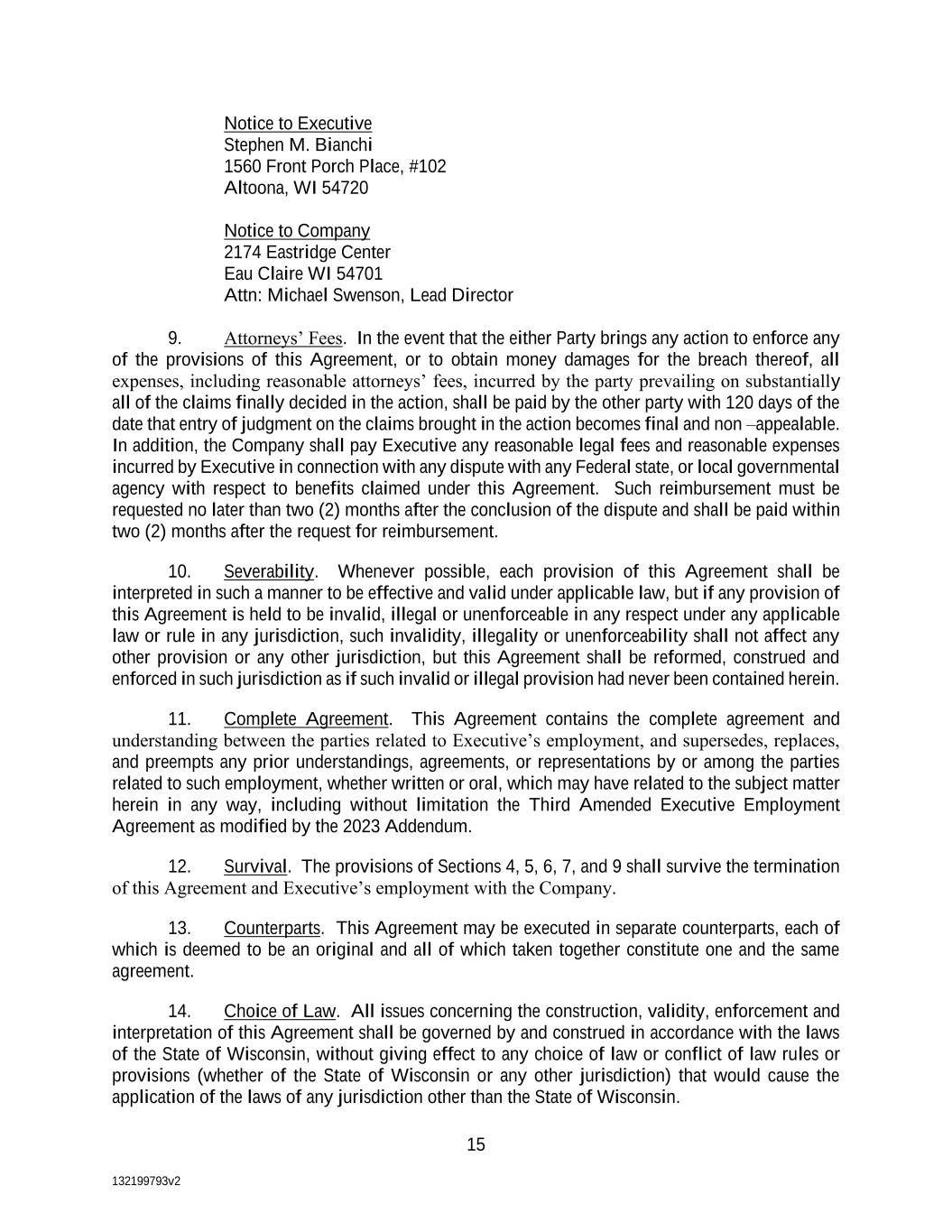 132199793v2 15 Notice to Executive Stephen M. Bianchi 1560 Front Porch Place, #102 Altoona, WI 54720 Notice to Company 2174 Eastridge Center Eau Claire WI 54701 Attn: Michael Swenson, Lead Director 9. Attorneys’ Fees. In the event that the either Party brings any action to enforce any of the provisions of this Agreement, or to obtain money damages for the breach thereof, all expenses, including reasonable attorneys’ fees, incurred by the party prevailing on substantially all of the claims finally decided in the action, shall be paid by the other party with 120 days of the date that entry of judgment on the claims brought in the action becomes final and non –appealable. In addition, the Company shall pay Executive any reasonable legal fees and reasonable expenses incurred by Executive in connection with any dispute with any Federal state, or local governmental agency with respect to benefits claimed under this Agreement. Such reimbursement must be requested no later than two (2) months after the conclusion of the dispute and shall be paid within two (2) months after the request for reimbursement. 10. Severability. Whenever possible, each provision of this Agreement shall be interpreted in such a manner to be effective and valid under applicable law, but if any provision of this Agreement is held to be invalid, illegal or unenforceable in any respect under any applicable law or rule in any jurisdiction, such invalidity, illegality or unenforceability shall not affect any other provision or any other jurisdiction, but this Agreement shall be reformed, construed and enforced in such jurisdiction as if such invalid or illegal provision had never been contained herein. 11. Complete Agreement. This Agreement contains the complete agreement and understanding between the parties related to Executive’s employment, and supersedes, replaces, and preempts any prior understandings, agreements, or representations by or among the parties related to such employment, whether written or oral, which may have related to the subject matter herein in any way, including without limitation the Third Amended Executive Employment Agreement as modified by the 2023 Addendum. 12. Survival. The provisions of Sections 4, 5, 6, 7, and 9 shall survive the termination of this Agreement and Executive’s employment with the Company. 13. Counterparts. This Agreement may be executed in separate counterparts, each of which is deemed to be an original and all of which taken together constitute one and the same agreement. 14. Choice of Law. All issues concerning the construction, validity, enforcement and interpretation of this Agreement shall be governed by and construed in accordance with the laws of the State of Wisconsin, without giving effect to any choice of law or conflict of law rules or provisions (whether of the State of Wisconsin or any other jurisdiction) that would cause the application of the laws of any jurisdiction other than the State of Wisconsin.