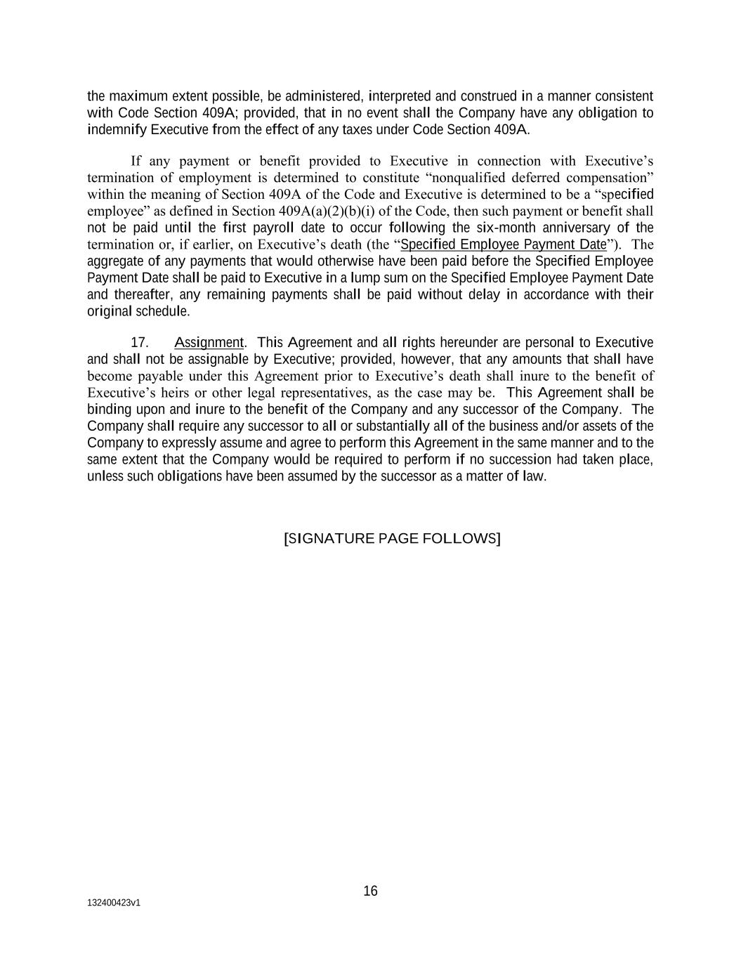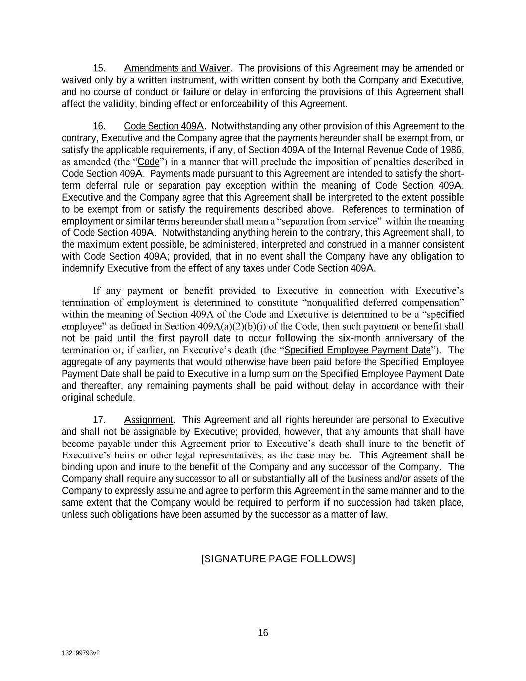 132199793v2 16 15. Amendments and Waiver. The provisions of this Agreement may be amended or waived only by a written instrument, with written consent by both the Company and Executive, and no course of conduct or failure or delay in enforcing the provisions of this Agreement shall affect the validity, binding effect or enforceability of this Agreement. 16. Code Section 409A. Notwithstanding any other provision of this Agreement to the contrary, Executive and the Company agree that the payments hereunder shall be exempt from, or satisfy the applicable requirements, if any, of Section 409A of the Internal Revenue Code of 1986, as amended (the “Code”) in a manner that will preclude the imposition of penalties described in Code Section 409A. Payments made pursuant to this Agreement are intended to satisfy the short- term deferral rule or separation pay exception within the meaning of Code Section 409A. Executive and the Company agree that this Agreement shall be interpreted to the extent possible to be exempt from or satisfy the requirements described above. References to termination of employment or similar terms hereunder shall mean a “separation from service” within the meaning of Code Section 409A. Notwithstanding anything herein to the contrary, this Agreement shall, to the maximum extent possible, be administered, interpreted and construed in a manner consistent with Code Section 409A; provided, that in no event shall the Company have any obligation to indemnify Executive from the effect of any taxes under Code Section 409A. If any payment or benefit provided to Executive in connection with Executive’s termination of employment is determined to constitute “nonqualified deferred compensation” within the meaning of Section 409A of the Code and Executive is determined to be a “specified employee” as defined in Section 409A(a)(2)(b)(i) of the Code, then such payment or benefit shall not be paid until the first payroll date to occur following the six-month anniversary of the termination or, if earlier, on Executive’s death (the “Specified Employee Payment Date”). The aggregate of any payments that would otherwise have been paid before the Specified Employee Payment Date shall be paid to Executive in a lump sum on the Specified Employee Payment Date and thereafter, any remaining payments shall be paid without delay in accordance with their original schedule. 17. Assignment. This Agreement and all rights hereunder are personal to Executive and shall not be assignable by Executive; provided, however, that any amounts that shall have become payable under this Agreement prior to Executive’s death shall inure to the benefit of Executive’s heirs or other legal representatives, as the case may be. This Agreement shall be binding upon and inure to the benefit of the Company and any successor of the Company. The Company shall require any successor to all or substantially all of the business and/or assets of the Company to expressly assume and agree to perform this Agreement in the same manner and to the same extent that the Company would be required to perform if no succession had taken place, unless such obligations have been assumed by the successor as a matter of law. [SIGNATURE PAGE FOLLOWS]
