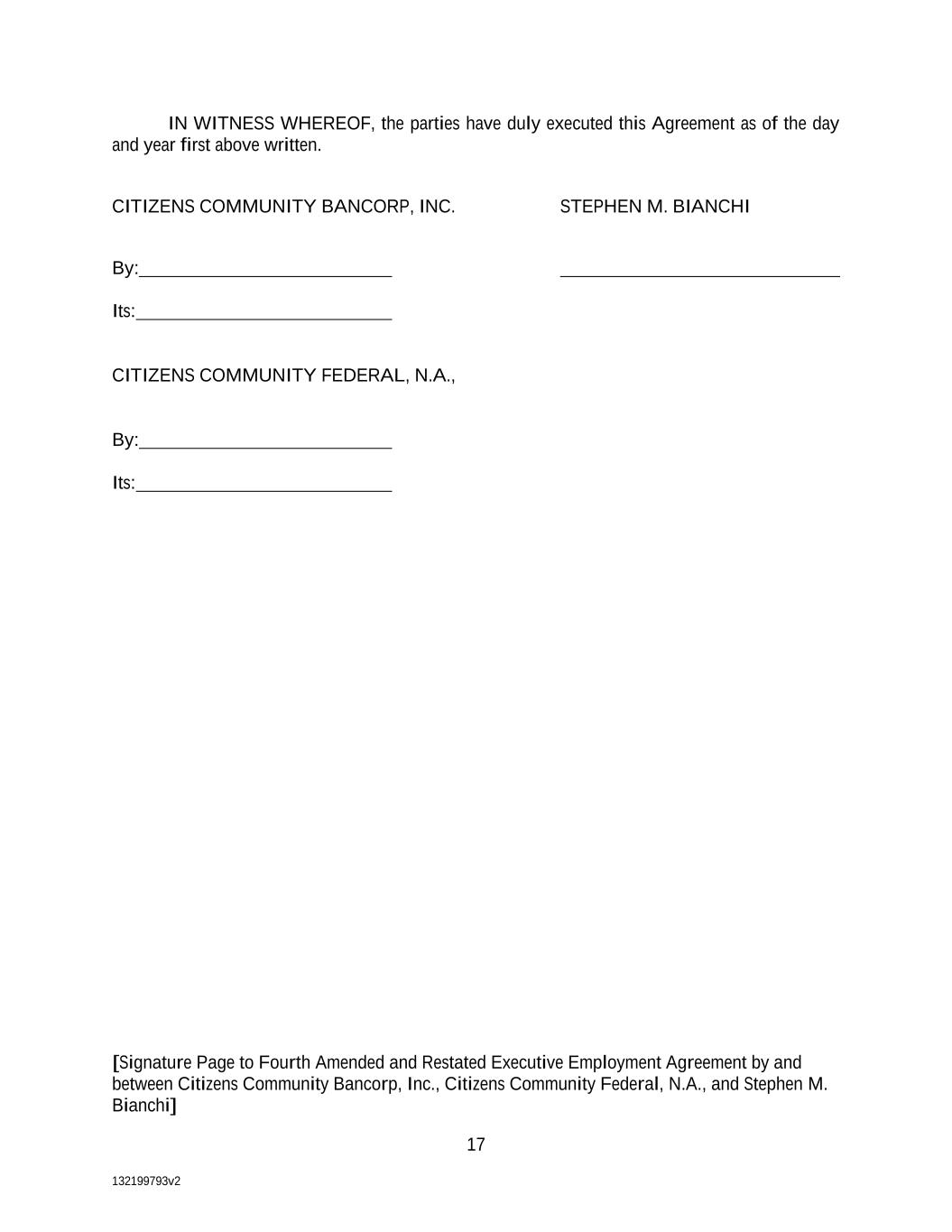 132199793v2 17 IN WITNESS WHEREOF, the parties have duly executed this Agreement as of the day and year first above written. CITIZENS COMMUNITY BANCORP, INC. STEPHEN M. BIANCHI By: Its: CITIZENS COMMUNITY FEDERAL, N.A., By: Its: [Signature Page to Fourth Amended and Restated Executive Employment Agreement by and between Citizens Community Bancorp, Inc., Citizens Community Federal, N.A., and Stephen M. Bianchi]