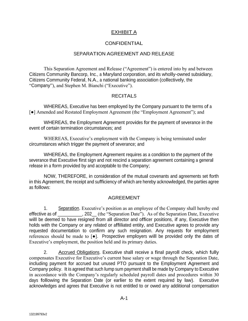 132199793v2 A-1 EXHIBIT A CONFIDENTIAL SEPARATION AGREEMENT AND RELEASE This Separation Agreement and Release (“Agreement”) is entered into by and between Citizens Community Bancorp, Inc., a Maryland corporation, and its wholly-owned subsidiary, Citizens Community Federal, N.A., a national banking association (collectively, the “Company”), and Stephen M. Bianchi (“Executive”). RECITALS WHEREAS, Executive has been employed by the Company pursuant to the terms of a [●] Amended and Restated Employment Agreement (the “Employment Agreement”); and WHEREAS, the Employment Agreement provides for the payment of severance in the event of certain termination circumstances; and WHEREAS, Executive’s employment with the Company is being terminated under circumstances which trigger the payment of severance; and WHEREAS, the Employment Agreement requires as a condition to the payment of the severance that Executive first sign and not rescind a separation agreement containing a general release in a form provided by and acceptable to the Company; NOW, THEREFORE, in consideration of the mutual covenants and agreements set forth in this Agreement, the receipt and sufficiency of which are hereby acknowledged, the parties agree as follows: AGREEMENT 1. Separation. Executive’s position as an employee of the Company shall hereby end effective as of __________, 202__ (the “Separation Date”). As of the Separation Date, Executive will be deemed to have resigned from all director and officer positions, if any, Executive then holds with the Company or any related or affiliated entity, and Executive agrees to provide any requested documentation to confirm any such resignation. Any requests for employment references should be made to [●]. Prospective employers will be provided only the dates of Executive’s employment, the position held and its primary duties. 2. Accrued Obligations. Executive shall receive a final payroll check, which fully compensates Executive for Executive’s current base salary or wage through the Separation Date, including payment for accrued but unused PTO pursuant to the Employment Agreement and Company policy. It is agreed that such lump sum payment shall be made by Company to Executive in accordance with the Company’s regularly scheduled payroll dates and procedures within 30 days following the Separation Date (or earlier to the extent required by law). Executive acknowledges and agrees that Executive is not entitled to or owed any additional compensation