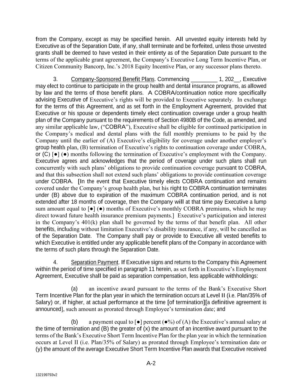 A-2 from the Company, except as may be specified herein. All unvested equity interests held by Executive as of the Separation Date, if any, shall terminate and be forfeited, unless those unvested grants shall be deemed to have vested in their entirety as of the Separation Date pursuant to the terms of the applicable grant agreement, the Company’s Executive Long Term Incentive Plan, or Citizen Community Bancorp, Inc.’s 2018 Equity Incentive Plan, or any successor plans thereto. 3. Company-Sponsored Benefit Plans. Commencing _________ 1, 202__, Executive may elect to continue to participate in the group health and dental insurance programs, as allowed by law and the terms of those benefit plans. A COBRA/continuation notice more specifically advising Executive of Executive’s rights will be provided to Executive separately. In exchange for the terms of this Agreement, and as set forth in the Employment Agreement, provided that Executive or his spouse or dependents timely elect continuation coverage under a group health plan of the Company pursuant to the requirements of Section 4980B of the Code, as amended, and any similar applicable law, (“COBRA”), Executive shall be eligible for continued participation in the Company’s medical and dental plans with the full monthly premiums to be paid by the Company until the earlier of (A) Executive’s eligibility for coverage under another employer’s group health plan, (B) termination of Executive’s rights to continuation coverage under COBRA, or (C) [●] (●) months following the termination of Executive’s employment with the Company. Executive agrees and acknowledges that the period of coverage under such plans shall run concurrently with such plans’ obligations to provide continuation coverage pursuant to COBRA, and that this subsection shall not extend such plans’ obligations to provide continuation coverage under COBRA. [In the event that Executive timely elects COBRA continuation and remains covered under the Company’s group health plan, but his right to COBRA continuation terminates under (B) above due to expiration of the maximum COBRA continuation period, and is not extended after 18 months of coverage, then the Company will at that time pay Executive a lump sum amount equal to [●] (●) months of Executive’s monthly COBRA premiums, which he may direct toward future health insurance premium payments.] Executive’s participation and interest in the Company’s 401(k) plan shall be governed by the terms of that benefit plan. All other benefits, including without limitation Executive’s disability insurance, if any, will be cancelled as of the Separation Date. The Company shall pay or provide to Executive all vested benefits to which Executive is entitled under any applicable benefit plans of the Company in accordance with the terms of such plans through the Separation Date. 4. Separation Payment. If Executive signs and returns to the Company this Agreement within the period of time specified in paragraph 11 herein, as set forth in Executive’s Employment Agreement, Executive shall be paid as separation compensation, less applicable withholdings: (a) an incentive award pursuant to the terms of the Bank’s Executive Short Term Incentive Plan for the plan year in which the termination occurs at Level II (i.e. Plan/30% of Salary) or, if higher, at actual performance at the time [of termination][a definitive agreement is announced], such amount as prorated through Employee’s termination date; and (b) a payment equal to [●] percent (●%) of (A) the Executive’s annual salary at the time of termination and (B) the greater of (x) the amount of an incentive award pursuant to the terms of the Bank’s Executive Short Term Incentive Plan for the plan year in which the termination occurs at Level II (i.e. Plan/30% of Salary) as prorated through Employee’s termination date or (y) the amount of the average Executive Short Term Incentive Plan awards that Executive received