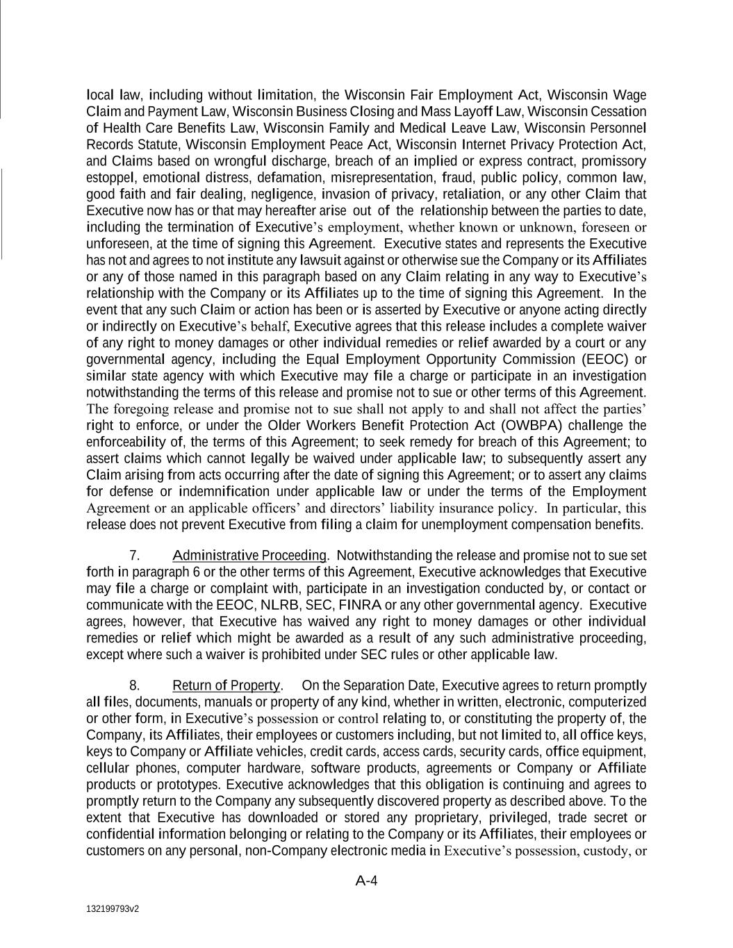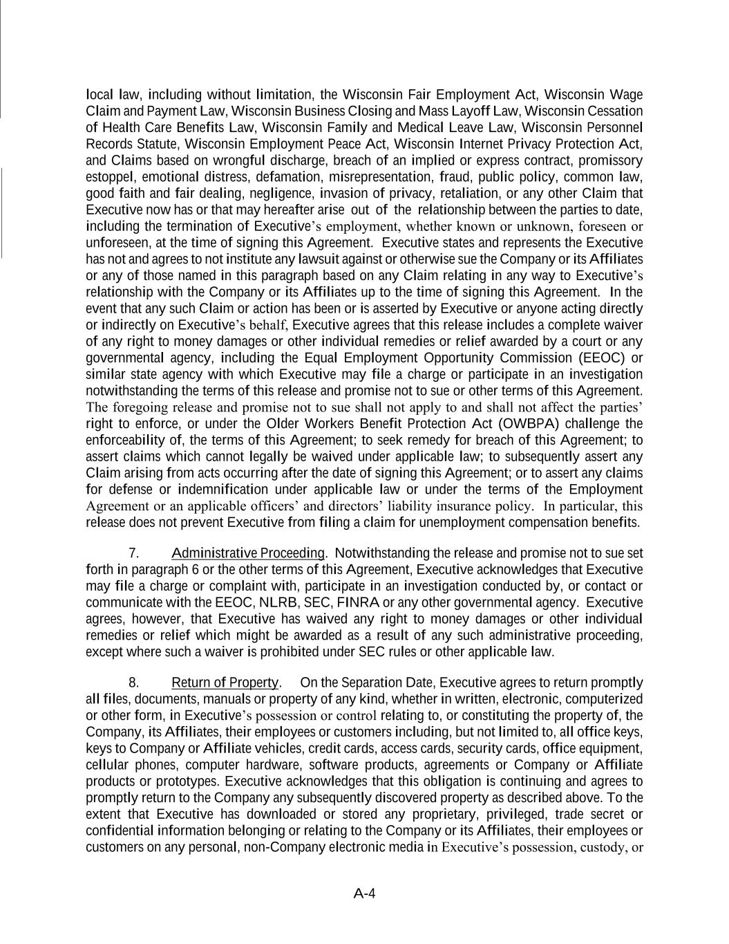 A-4 local law, including without limitation, the Wisconsin Fair Employment Act, Wisconsin Wage Claim and Payment Law, Wisconsin Business Closing and Mass Layoff Law, Wisconsin Cessation of Health Care Benefits Law, Wisconsin Family and Medical Leave Law, Wisconsin Personnel Records Statute, Wisconsin Employment Peace Act, Wisconsin Internet Privacy Protection Act, and Claims based on wrongful discharge, breach of an implied or express contract, promissory estoppel, emotional distress, defamation, misrepresentation, fraud, public policy, common law, good faith and fair dealing, negligence, invasion of privacy, retaliation, or any other Claim that Executive now has or that may hereafter arise out of the relationship between the parties to date, including the termination of Executive’s employment, whether known or unknown, foreseen or unforeseen, at the time of signing this Agreement. Executive states and represents the Executive has not and agrees to not institute any lawsuit against or otherwise sue the Company or its Affiliates or any of those named in this paragraph based on any Claim relating in any way to Executive’s relationship with the Company or its Affiliates up to the time of signing this Agreement. In the event that any such Claim or action has been or is asserted by Executive or anyone acting directly or indirectly on Executive’s behalf, Executive agrees that this release includes a complete waiver of any right to money damages or other individual remedies or relief awarded by a court or any governmental agency, including the Equal Employment Opportunity Commission (EEOC) or similar state agency with which Executive may file a charge or participate in an investigation notwithstanding the terms of this release and promise not to sue or other terms of this Agreement. The foregoing release and promise not to sue shall not apply to and shall not affect the parties’ right to enforce, or under the Older Workers Benefit Protection Act (OWBPA) challenge the enforceability of, the terms of this Agreement; to seek remedy for breach of this Agreement; to assert claims which cannot legally be waived under applicable law; to subsequently assert any Claim arising from acts occurring after the date of signing this Agreement; or to assert any claims for defense or indemnification under applicable law or under the terms of the Employment Agreement or an applicable officers’ and directors’ liability insurance policy. In particular, this release does not prevent Executive from filing a claim for unemployment compensation benefits. 7. Administrative Proceeding. Notwithstanding the release and promise not to sue set forth in paragraph 6 or the other terms of this Agreement, Executive acknowledges that Executive may file a charge or complaint with, participate in an investigation conducted by, or contact or communicate with the EEOC, NLRB, SEC, FINRA or any other governmental agency. Executive agrees, however, that Executive has waived any right to money damages or other individual remedies or relief which might be awarded as a result of any such administrative proceeding, except where such a waiver is prohibited under SEC rules or other applicable law. 8. Return of Property. On the Separation Date, Executive agrees to return promptly all files, documents, manuals or property of any kind, whether in written, electronic, computerized or other form, in Executive’s possession or control relating to, or constituting the property of, the Company, its Affiliates, their employees or customers including, but not limited to, all office keys, keys to Company or Affiliate vehicles, credit cards, access cards, security cards, office equipment, cellular phones, computer hardware, software products, agreements or Company or Affiliate products or prototypes. Executive acknowledges that this obligation is continuing and agrees to promptly return to the Company any subsequently discovered property as described above. To the extent that Executive has downloaded or stored any proprietary, privileged, trade secret or confidential information belonging or relating to the Company or its Affiliates, their employees or customers on any personal, non-Company electronic media in Executive’s possession, custody, or