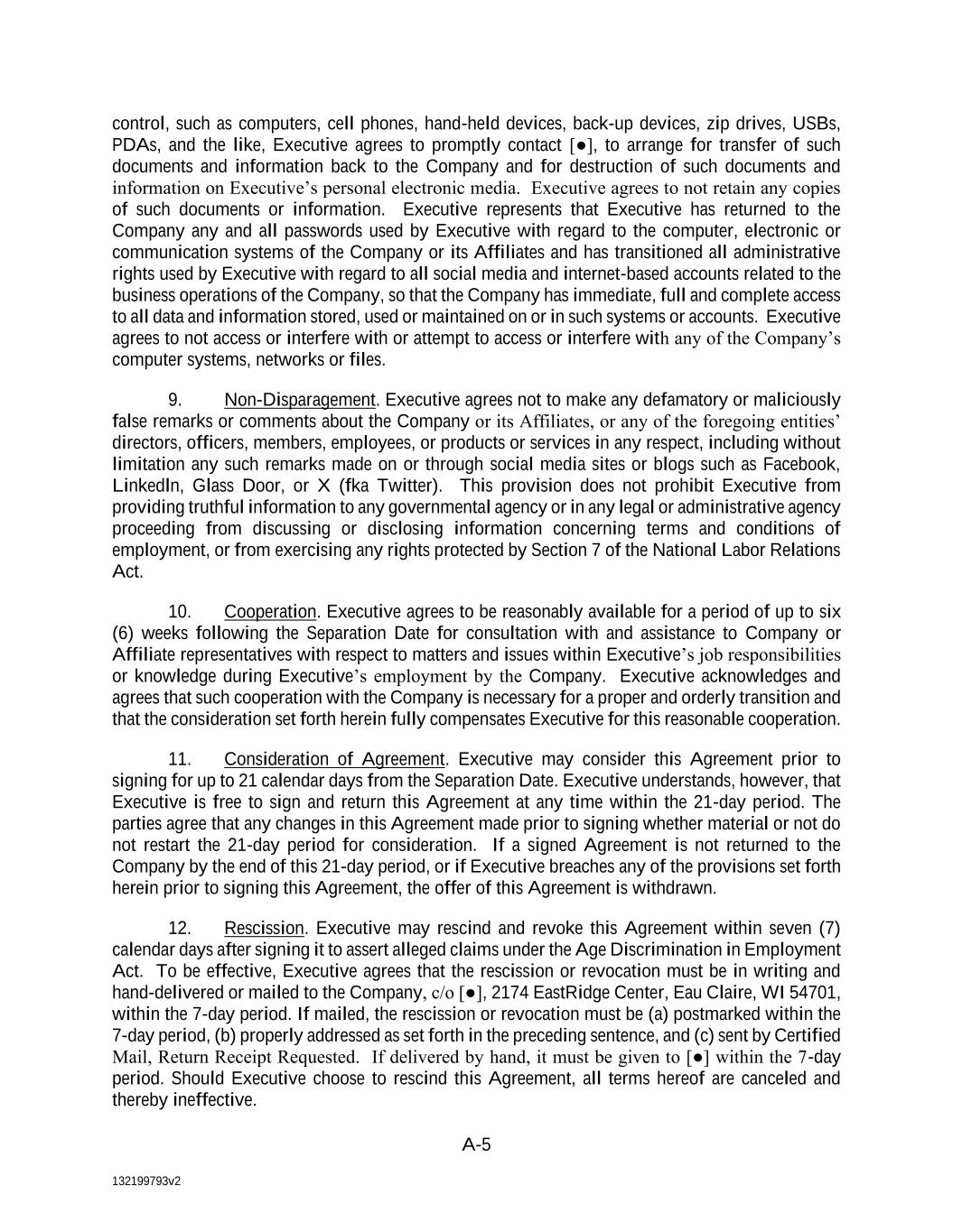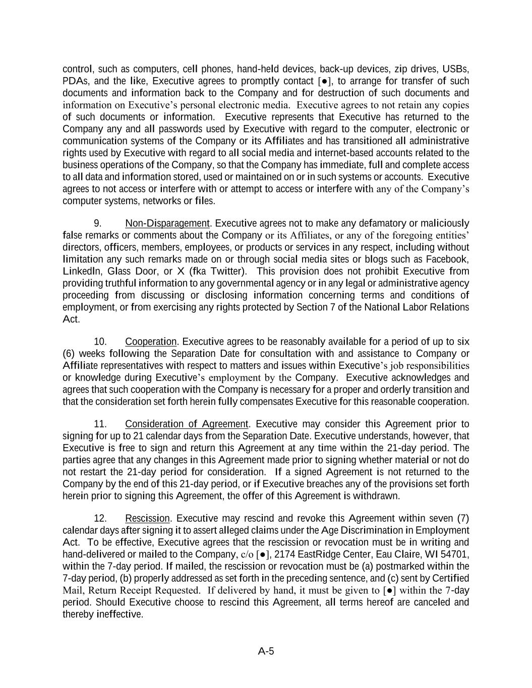 A-5 control, such as computers, cell phones, hand-held devices, back-up devices, zip drives, USBs, PDAs, and the like, Executive agrees to promptly contact [●], to arrange for transfer of such documents and information back to the Company and for destruction of such documents and information on Executive’s personal electronic media. Executive agrees to not retain any copies of such documents or information. Executive represents that Executive has returned to the Company any and all passwords used by Executive with regard to the computer, electronic or communication systems of the Company or its Affiliates and has transitioned all administrative rights used by Executive with regard to all social media and internet-based accounts related to the business operations of the Company, so that the Company has immediate, full and complete access to all data and information stored, used or maintained on or in such systems or accounts. Executive agrees to not access or interfere with or attempt to access or interfere with any of the Company’s computer systems, networks or files. 9. Non-Disparagement. Executive agrees not to make any defamatory or maliciously false remarks or comments about the Company or its Affiliates, or any of the foregoing entities’ directors, officers, members, employees, or products or services in any respect, including without limitation any such remarks made on or through social media sites or blogs such as Facebook, Linkedln, Glass Door, or X (fka Twitter). This provision does not prohibit Executive from providing truthful information to any governmental agency or in any legal or administrative agency proceeding from discussing or disclosing information concerning terms and conditions of employment, or from exercising any rights protected by Section 7 of the National Labor Relations Act. 10. Cooperation. Executive agrees to be reasonably available for a period of up to six (6) weeks following the Separation Date for consultation with and assistance to Company or Affiliate representatives with respect to matters and issues within Executive’s job responsibilities or knowledge during Executive’s employment by the Company. Executive acknowledges and agrees that such cooperation with the Company is necessary for a proper and orderly transition and that the consideration set forth herein fully compensates Executive for this reasonable cooperation. 11. Consideration of Agreement. Executive may consider this Agreement prior to signing for up to 21 calendar days from the Separation Date. Executive understands, however, that Executive is free to sign and return this Agreement at any time within the 21-day period. The parties agree that any changes in this Agreement made prior to signing whether material or not do not restart the 21-day period for consideration. If a signed Agreement is not returned to the Company by the end of this 21-day period, or if Executive breaches any of the provisions set forth herein prior to signing this Agreement, the offer of this Agreement is withdrawn. 12. Rescission. Executive may rescind and revoke this Agreement within seven (7) calendar days after signing it to assert alleged claims under the Age Discrimination in Employment Act. To be effective, Executive agrees that the rescission or revocation must be in writing and hand-delivered or mailed to the Company, c/o [●], 2174 EastRidge Center, Eau Claire, WI 54701, within the 7-day period. If mailed, the rescission or revocation must be (a) postmarked within the 7-day period, (b) properly addressed as set forth in the preceding sentence, and (c) sent by Certified Mail, Return Receipt Requested. If delivered by hand, it must be given to [●] within the 7-day period. Should Executive choose to rescind this Agreement, all terms hereof are canceled and thereby ineffective.