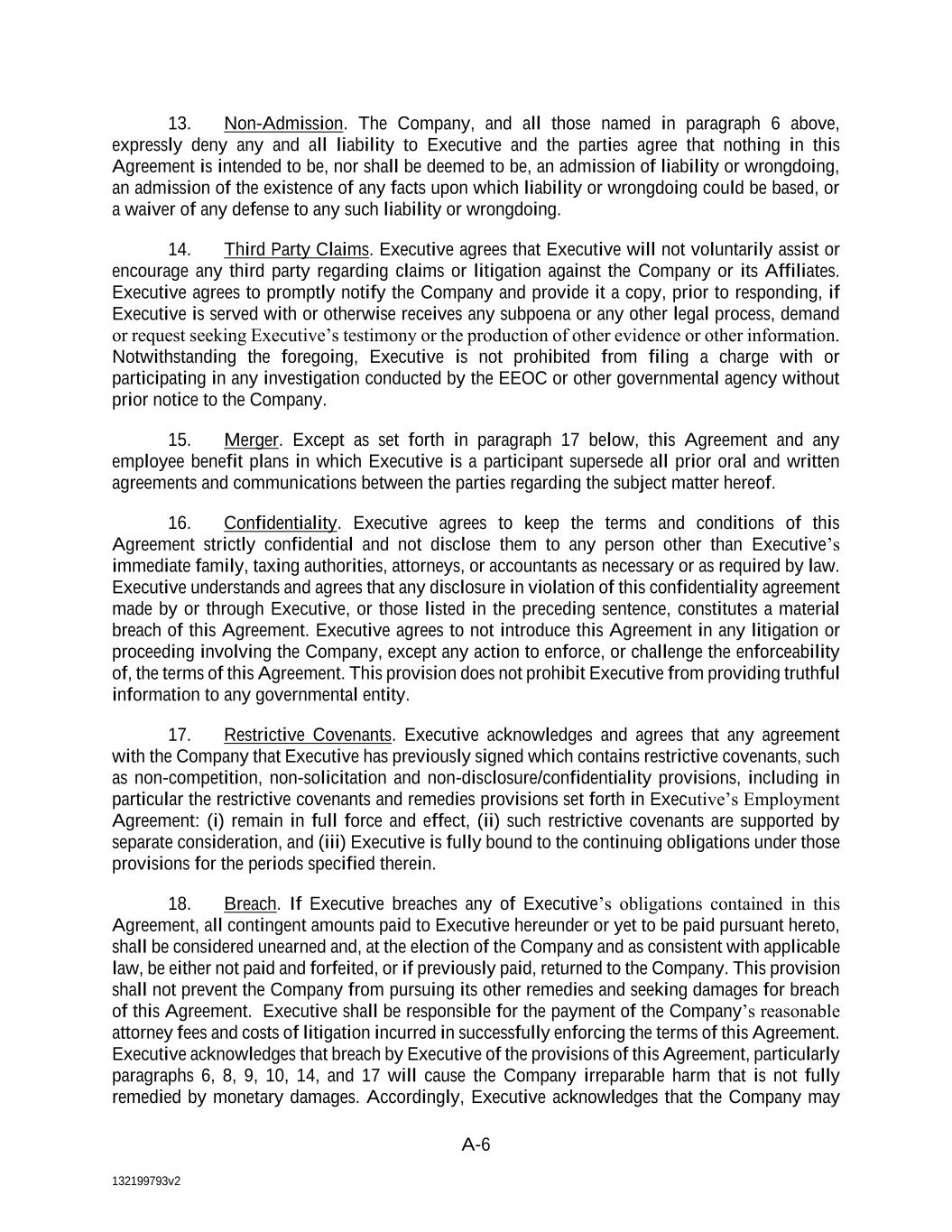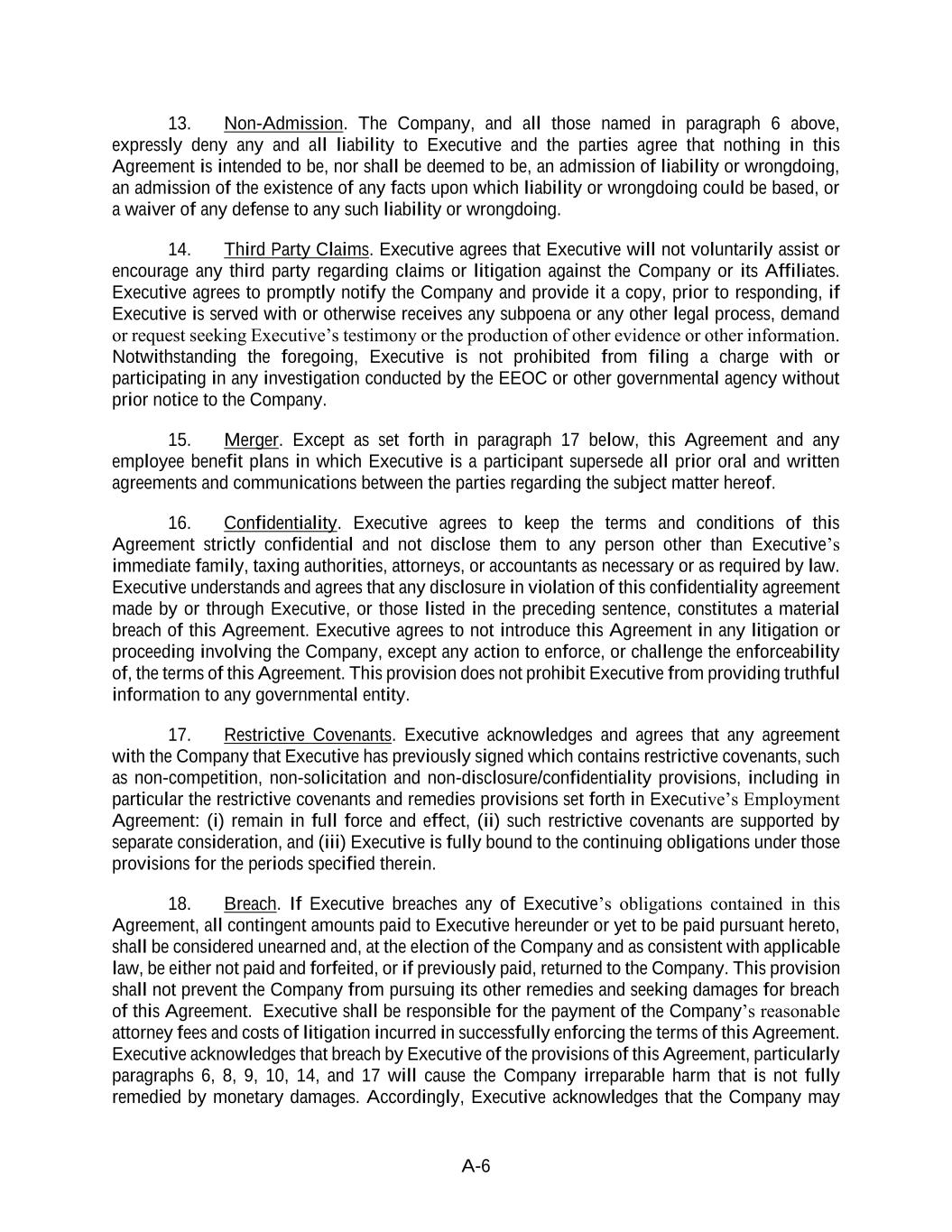 A-6 13. Non-Admission. The Company, and all those named in paragraph 6 above, expressly deny any and all liability to Executive and the parties agree that nothing in this Agreement is intended to be, nor shall be deemed to be, an admission of liability or wrongdoing, an admission of the existence of any facts upon which liability or wrongdoing could be based, or a waiver of any defense to any such liability or wrongdoing. 14. Third Party Claims. Executive agrees that Executive will not voluntarily assist or encourage any third party regarding claims or litigation against the Company or its Affiliates. Executive agrees to promptly notify the Company and provide it a copy, prior to responding, if Executive is served with or otherwise receives any subpoena or any other legal process, demand or request seeking Executive’s testimony or the production of other evidence or other information. Notwithstanding the foregoing, Executive is not prohibited from filing a charge with or participating in any investigation conducted by the EEOC or other governmental agency without prior notice to the Company. 15. Merger. Except as set forth in paragraph 17 below, this Agreement and any employee benefit plans in which Executive is a participant supersede all prior oral and written agreements and communications between the parties regarding the subject matter hereof. 16. Confidentiality. Executive agrees to keep the terms and conditions of this Agreement strictly confidential and not disclose them to any person other than Executive’s immediate family, taxing authorities, attorneys, or accountants as necessary or as required by law. Executive understands and agrees that any disclosure in violation of this confidentiality agreement made by or through Executive, or those listed in the preceding sentence, constitutes a material breach of this Agreement. Executive agrees to not introduce this Agreement in any litigation or proceeding involving the Company, except any action to enforce, or challenge the enforceability of, the terms of this Agreement. This provision does not prohibit Executive from providing truthful information to any governmental entity. 17. Restrictive Covenants. Executive acknowledges and agrees that any agreement with the Company that Executive has previously signed which contains restrictive covenants, such as non-competition, non-solicitation and non-disclosure/confidentiality provisions, including in particular the restrictive covenants and remedies provisions set forth in Executive’s Employment Agreement: (i) remain in full force and effect, (ii) such restrictive covenants are supported by separate consideration, and (iii) Executive is fully bound to the continuing obligations under those provisions for the periods specified therein. 18. Breach. If Executive breaches any of Executive’s obligations contained in this Agreement, all contingent amounts paid to Executive hereunder or yet to be paid pursuant hereto, shall be considered unearned and, at the election of the Company and as consistent with applicable law, be either not paid and forfeited, or if previously paid, returned to the Company. This provision shall not prevent the Company from pursuing its other remedies and seeking damages for breach of this Agreement. Executive shall be responsible for the payment of the Company’s reasonable attorney fees and costs of litigation incurred in successfully enforcing the terms of this Agreement. Executive acknowledges that breach by Executive of the provisions of this Agreement, particularly paragraphs 6, 8, 9, 10, 14, and 17 will cause the Company irreparable harm that is not fully remedied by monetary damages. Accordingly, Executive acknowledges that the Company may
