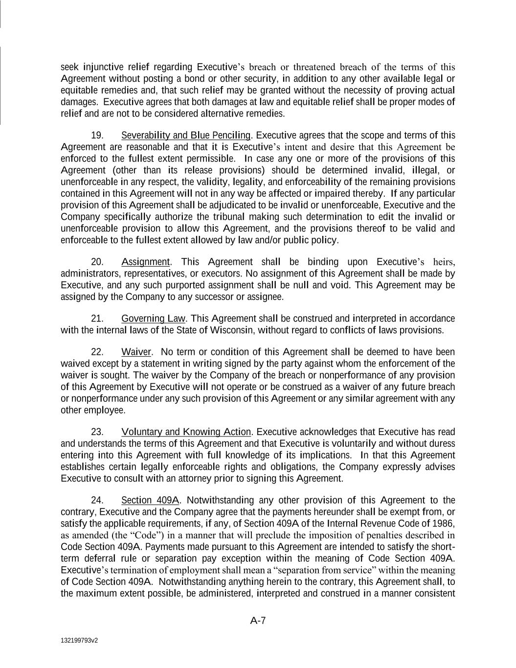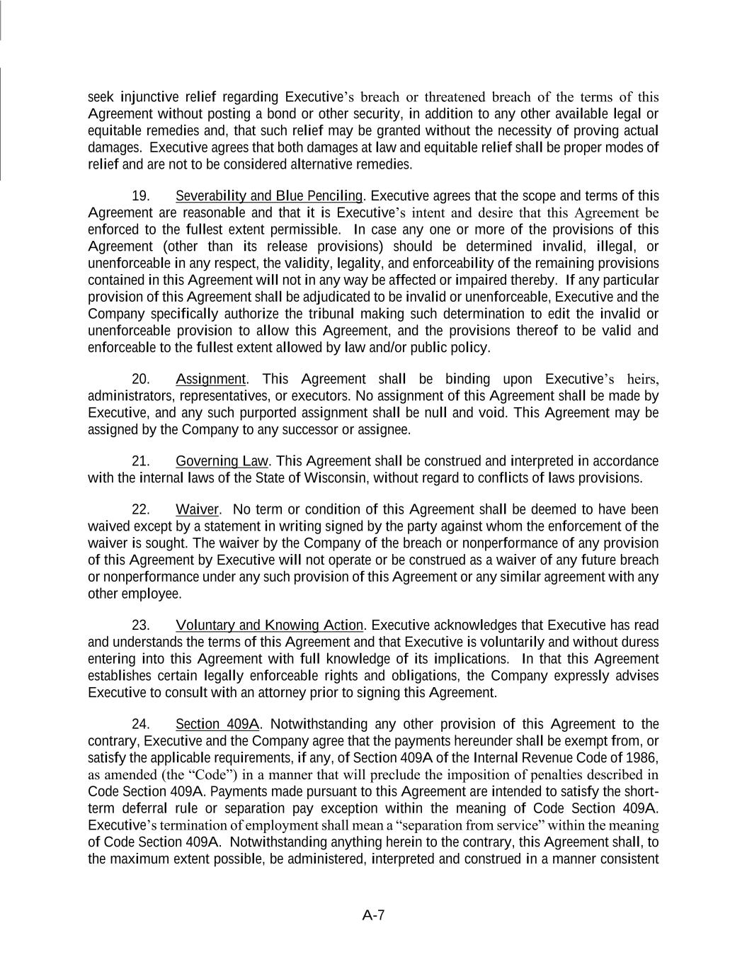 A-7 seek injunctive relief regarding Executive’s breach or threatened breach of the terms of this Agreement without posting a bond or other security, in addition to any other available legal or equitable remedies and, that such relief may be granted without the necessity of proving actual damages. Executive agrees that both damages at law and equitable relief shall be proper modes of relief and are not to be considered alternative remedies. 19. Severability and Blue Penciling. Executive agrees that the scope and terms of this Agreement are reasonable and that it is Executive’s intent and desire that this Agreement be enforced to the fullest extent permissible. In case any one or more of the provisions of this Agreement (other than its release provisions) should be determined invalid, illegal, or unenforceable in any respect, the validity, legality, and enforceability of the remaining provisions contained in this Agreement will not in any way be affected or impaired thereby. If any particular provision of this Agreement shall be adjudicated to be invalid or unenforceable, Executive and the Company specifically authorize the tribunal making such determination to edit the invalid or unenforceable provision to allow this Agreement, and the provisions thereof to be valid and enforceable to the fullest extent allowed by law and/or public policy. 20. Assignment. This Agreement shall be binding upon Executive’s heirs, administrators, representatives, or executors. No assignment of this Agreement shall be made by Executive, and any such purported assignment shall be null and void. This Agreement may be assigned by the Company to any successor or assignee. 21. Governing Law. This Agreement shall be construed and interpreted in accordance with the internal laws of the State of Wisconsin, without regard to conflicts of laws provisions. 22. Waiver. No term or condition of this Agreement shall be deemed to have been waived except by a statement in writing signed by the party against whom the enforcement of the waiver is sought. The waiver by the Company of the breach or nonperformance of any provision of this Agreement by Executive will not operate or be construed as a waiver of any future breach or nonperformance under any such provision of this Agreement or any similar agreement with any other employee. 23. Voluntary and Knowing Action. Executive acknowledges that Executive has read and understands the terms of this Agreement and that Executive is voluntarily and without duress entering into this Agreement with full knowledge of its implications. In that this Agreement establishes certain legally enforceable rights and obligations, the Company expressly advises Executive to consult with an attorney prior to signing this Agreement. 24. Section 409A. Notwithstanding any other provision of this Agreement to the contrary, Executive and the Company agree that the payments hereunder shall be exempt from, or satisfy the applicable requirements, if any, of Section 409A of the Internal Revenue Code of 1986, as amended (the “Code”) in a manner that will preclude the imposition of penalties described in Code Section 409A. Payments made pursuant to this Agreement are intended to satisfy the short- term deferral rule or separation pay exception within the meaning of Code Section 409A. Executive’s termination of employment shall mean a “separation from service” within the meaning of Code Section 409A. Notwithstanding anything herein to the contrary, this Agreement shall, to the maximum extent possible, be administered, interpreted and construed in a manner consistent