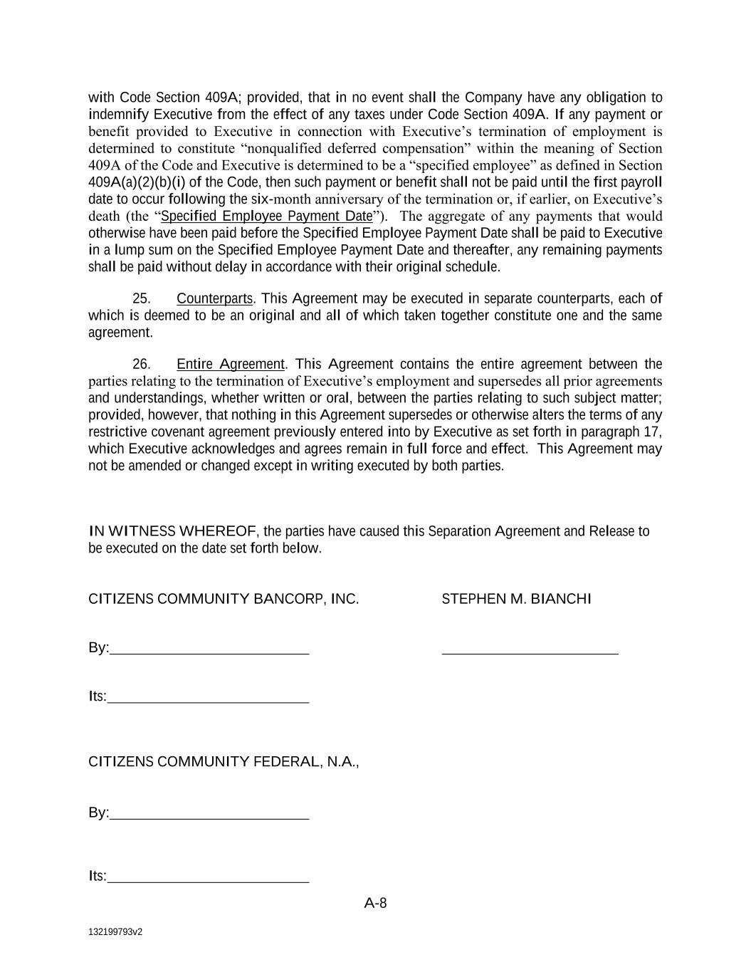 132199793v2 A-8 with Code Section 409A; provided, that in no event shall the Company have any obligation to indemnify Executive from the effect of any taxes under Code Section 409A. If any payment or benefit provided to Executive in connection with Executive’s termination of employment is determined to constitute “nonqualified deferred compensation” within the meaning of Section 409A of the Code and Executive is determined to be a “specified employee” as defined in Section 409A(a)(2)(b)(i) of the Code, then such payment or benefit shall not be paid until the first payroll date to occur following the six-month anniversary of the termination or, if earlier, on Executive’s death (the “Specified Employee Payment Date”). The aggregate of any payments that would otherwise have been paid before the Specified Employee Payment Date shall be paid to Executive in a lump sum on the Specified Employee Payment Date and thereafter, any remaining payments shall be paid without delay in accordance with their original schedule. 25. Counterparts. This Agreement may be executed in separate counterparts, each of which is deemed to be an original and all of which taken together constitute one and the same agreement. 26. Entire Agreement. This Agreement contains the entire agreement between the parties relating to the termination of Executive’s employment and supersedes all prior agreements and understandings, whether written or oral, between the parties relating to such subject matter; provided, however, that nothing in this Agreement supersedes or otherwise alters the terms of any restrictive covenant agreement previously entered into by Executive as set forth in paragraph 17, which Executive acknowledges and agrees remain in full force and effect. This Agreement may not be amended or changed except in writing executed by both parties. IN WITNESS WHEREOF, the parties have caused this Separation Agreement and Release to be executed on the date set forth below. CITIZENS COMMUNITY BANCORP, INC. STEPHEN M. BIANCHI By: Its: CITIZENS COMMUNITY FEDERAL, N.A., By: Its: