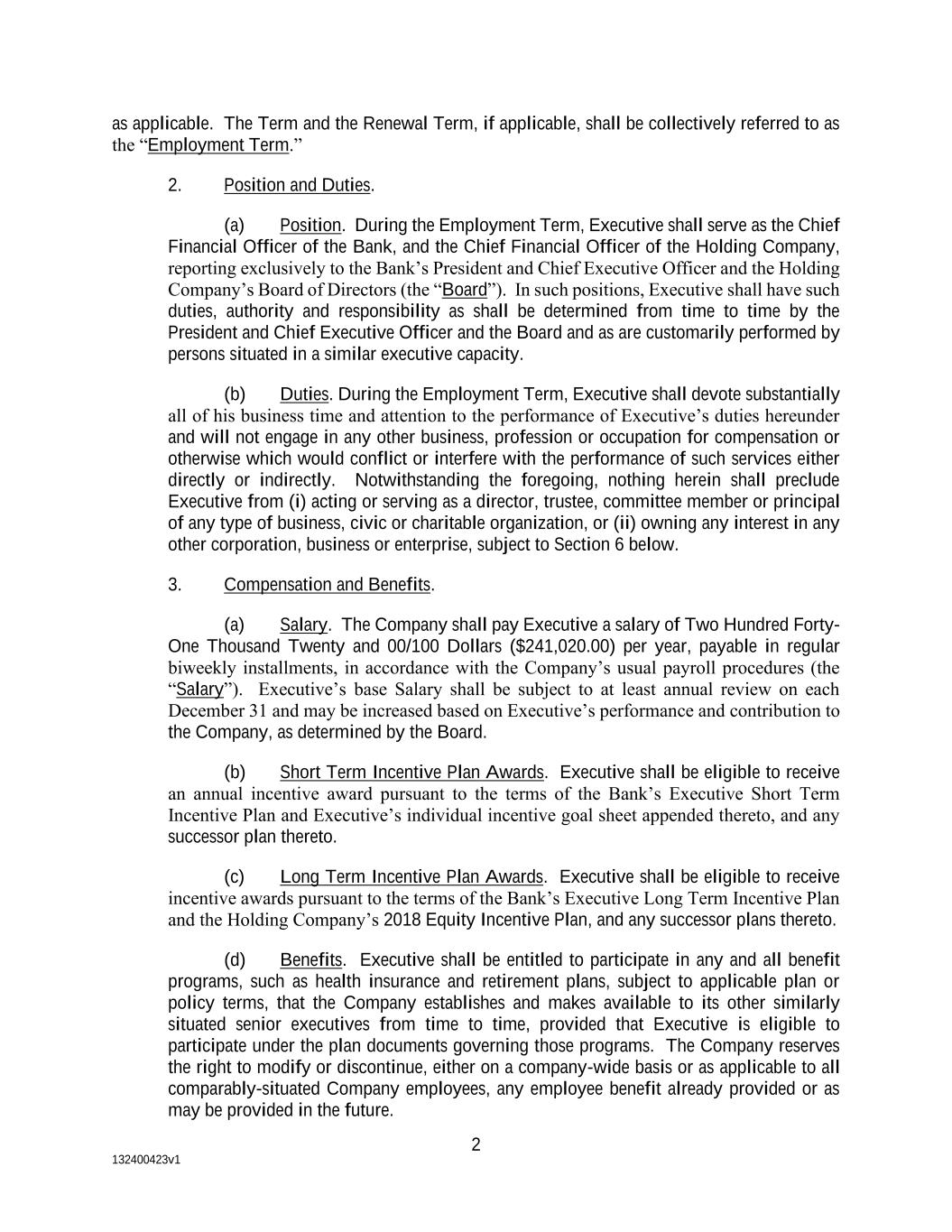132400423v1 2 as applicable. The Term and the Renewal Term, if applicable, shall be collectively referred to as the “Employment Term.” 2. Position and Duties. (a) Position. During the Employment Term, Executive shall serve as the Chief Financial Officer of the Bank, and the Chief Financial Officer of the Holding Company, reporting exclusively to the Bank’s President and Chief Executive Officer and the Holding Company’s Board of Directors (the “Board”). In such positions, Executive shall have such duties, authority and responsibility as shall be determined from time to time by the President and Chief Executive Officer and the Board and as are customarily performed by persons situated in a similar executive capacity. (b) Duties. During the Employment Term, Executive shall devote substantially all of his business time and attention to the performance of Executive’s duties hereunder and will not engage in any other business, profession or occupation for compensation or otherwise which would conflict or interfere with the performance of such services either directly or indirectly. Notwithstanding the foregoing, nothing herein shall preclude Executive from (i) acting or serving as a director, trustee, committee member or principal of any type of business, civic or charitable organization, or (ii) owning any interest in any other corporation, business or enterprise, subject to Section 6 below. 3. Compensation and Benefits. (a) Salary. The Company shall pay Executive a salary of Two Hundred Forty- One Thousand Twenty and 00/100 Dollars ($241,020.00) per year, payable in regular biweekly installments, in accordance with the Company’s usual payroll procedures (the “Salary”). Executive’s base Salary shall be subject to at least annual review on each December 31 and may be increased based on Executive’s performance and contribution to the Company, as determined by the Board. (b) Short Term Incentive Plan Awards. Executive shall be eligible to receive an annual incentive award pursuant to the terms of the Bank’s Executive Short Term Incentive Plan and Executive’s individual incentive goal sheet appended thereto, and any successor plan thereto. (c) Long Term Incentive Plan Awards. Executive shall be eligible to receive incentive awards pursuant to the terms of the Bank’s Executive Long Term Incentive Plan and the Holding Company’s 2018 Equity Incentive Plan, and any successor plans thereto. (d) Benefits. Executive shall be entitled to participate in any and all benefit programs, such as health insurance and retirement plans, subject to applicable plan or policy terms, that the Company establishes and makes available to its other similarly situated senior executives from time to time, provided that Executive is eligible to participate under the plan documents governing those programs. The Company reserves the right to modify or discontinue, either on a company-wide basis or as applicable to all comparably-situated Company employees, any employee benefit already provided or as may be provided in the future.