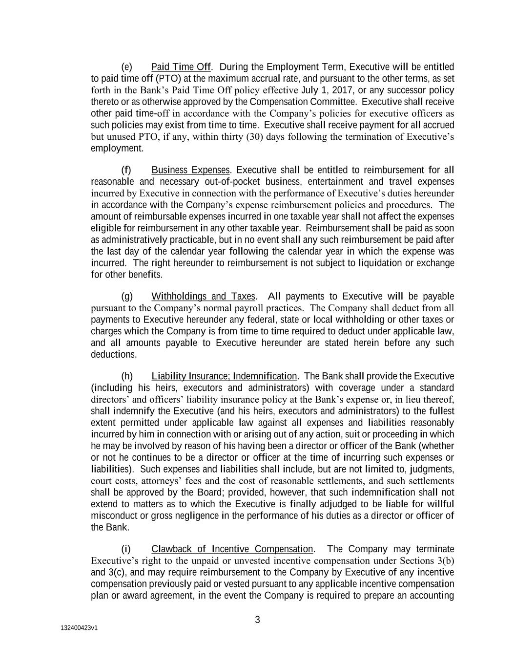 132400423v1 3 (e) Paid Time Off. During the Employment Term, Executive will be entitled to paid time off (PTO) at the maximum accrual rate, and pursuant to the other terms, as set forth in the Bank’s Paid Time Off policy effective July 1, 2017, or any successor policy thereto or as otherwise approved by the Compensation Committee. Executive shall receive other paid time-off in accordance with the Company’s policies for executive officers as such policies may exist from time to time. Executive shall receive payment for all accrued but unused PTO, if any, within thirty (30) days following the termination of Executive’s employment. (f) Business Expenses. Executive shall be entitled to reimbursement for all reasonable and necessary out-of-pocket business, entertainment and travel expenses incurred by Executive in connection with the performance of Executive’s duties hereunder in accordance with the Company’s expense reimbursement policies and procedures. The amount of reimbursable expenses incurred in one taxable year shall not affect the expenses eligible for reimbursement in any other taxable year. Reimbursement shall be paid as soon as administratively practicable, but in no event shall any such reimbursement be paid after the last day of the calendar year following the calendar year in which the expense was incurred. The right hereunder to reimbursement is not subject to liquidation or exchange for other benefits. (g) Withholdings and Taxes. All payments to Executive will be payable pursuant to the Company’s normal payroll practices. The Company shall deduct from all payments to Executive hereunder any federal, state or local withholding or other taxes or charges which the Company is from time to time required to deduct under applicable law, and all amounts payable to Executive hereunder are stated herein before any such deductions. (h) Liability Insurance; Indemnification. The Bank shall provide the Executive (including his heirs, executors and administrators) with coverage under a standard directors’ and officers’ liability insurance policy at the Bank’s expense or, in lieu thereof, shall indemnify the Executive (and his heirs, executors and administrators) to the fullest extent permitted under applicable law against all expenses and liabilities reasonably incurred by him in connection with or arising out of any action, suit or proceeding in which he may be involved by reason of his having been a director or officer of the Bank (whether or not he continues to be a director or officer at the time of incurring such expenses or liabilities). Such expenses and liabilities shall include, but are not limited to, judgments, court costs, attorneys’ fees and the cost of reasonable settlements, and such settlements shall be approved by the Board; provided, however, that such indemnification shall not extend to matters as to which the Executive is finally adjudged to be liable for willful misconduct or gross negligence in the performance of his duties as a director or officer of the Bank. (i) Clawback of Incentive Compensation. The Company may terminate Executive’s right to the unpaid or unvested incentive compensation under Sections 3(b) and 3(c), and may require reimbursement to the Company by Executive of any incentive compensation previously paid or vested pursuant to any applicable incentive compensation plan or award agreement, in the event the Company is required to prepare an accounting