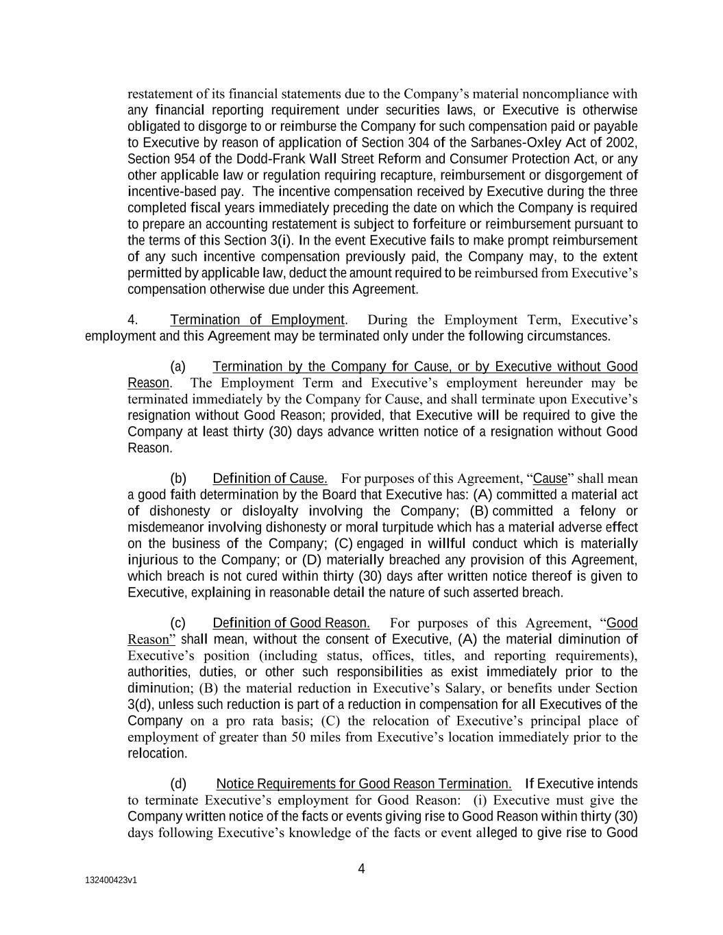 132400423v1 4 restatement of its financial statements due to the Company’s material noncompliance with any financial reporting requirement under securities laws, or Executive is otherwise obligated to disgorge to or reimburse the Company for such compensation paid or payable to Executive by reason of application of Section 304 of the Sarbanes-Oxley Act of 2002, Section 954 of the Dodd-Frank Wall Street Reform and Consumer Protection Act, or any other applicable law or regulation requiring recapture, reimbursement or disgorgement of incentive-based pay. The incentive compensation received by Executive during the three completed fiscal years immediately preceding the date on which the Company is required to prepare an accounting restatement is subject to forfeiture or reimbursement pursuant to the terms of this Section 3(i). In the event Executive fails to make prompt reimbursement of any such incentive compensation previously paid, the Company may, to the extent permitted by applicable law, deduct the amount required to be reimbursed from Executive’s compensation otherwise due under this Agreement. 4. Termination of Employment. During the Employment Term, Executive’s employment and this Agreement may be terminated only under the following circumstances. (a) Termination by the Company for Cause, or by Executive without Good Reason. The Employment Term and Executive’s employment hereunder may be terminated immediately by the Company for Cause, and shall terminate upon Executive’s resignation without Good Reason; provided, that Executive will be required to give the Company at least thirty (30) days advance written notice of a resignation without Good Reason. (b) Definition of Cause. For purposes of this Agreement, “Cause” shall mean a good faith determination by the Board that Executive has: (A) committed a material act of dishonesty or disloyalty involving the Company; (B) committed a felony or misdemeanor involving dishonesty or moral turpitude which has a material adverse effect on the business of the Company; (C) engaged in willful conduct which is materially injurious to the Company; or (D) materially breached any provision of this Agreement, which breach is not cured within thirty (30) days after written notice thereof is given to Executive, explaining in reasonable detail the nature of such asserted breach. (c) Definition of Good Reason. For purposes of this Agreement, “Good Reason” shall mean, without the consent of Executive, (A) the material diminution of Executive’s position (including status, offices, titles, and reporting requirements), authorities, duties, or other such responsibilities as exist immediately prior to the diminution; (B) the material reduction in Executive’s Salary, or benefits under Section 3(d), unless such reduction is part of a reduction in compensation for all Executives of the Company on a pro rata basis; (C) the relocation of Executive’s principal place of employment of greater than 50 miles from Executive’s location immediately prior to the relocation. (d) Notice Requirements for Good Reason Termination. If Executive intends to terminate Executive’s employment for Good Reason: (i) Executive must give the Company written notice of the facts or events giving rise to Good Reason within thirty (30) days following Executive’s knowledge of the facts or event alleged to give rise to Good