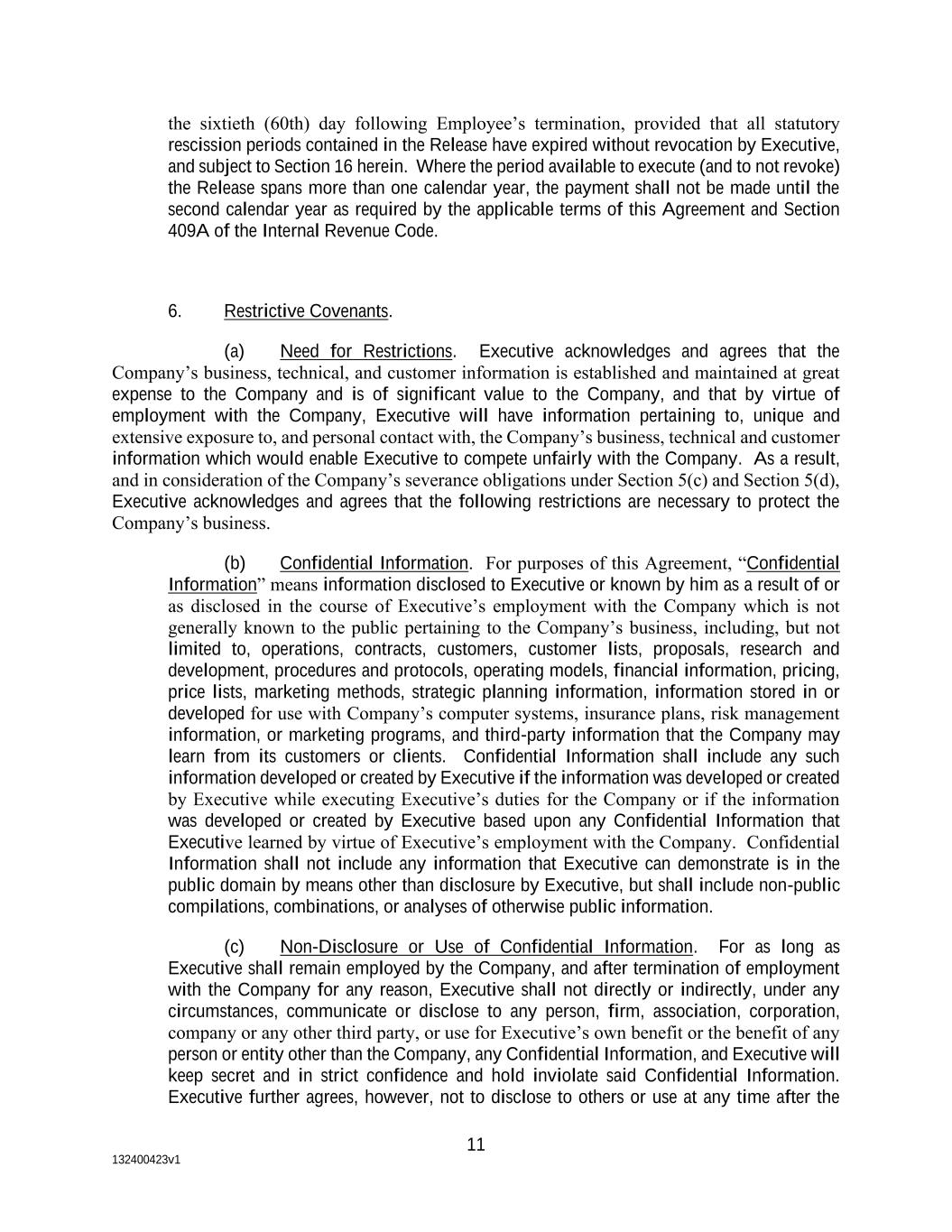132400423v1 11 the sixtieth (60th) day following Employee’s termination, provided that all statutory rescission periods contained in the Release have expired without revocation by Executive, and subject to Section 16 herein. Where the period available to execute (and to not revoke) the Release spans more than one calendar year, the payment shall not be made until the second calendar year as required by the applicable terms of this Agreement and Section 409A of the Internal Revenue Code. 6. Restrictive Covenants. (a) Need for Restrictions. Executive acknowledges and agrees that the Company’s business, technical, and customer information is established and maintained at great expense to the Company and is of significant value to the Company, and that by virtue of employment with the Company, Executive will have information pertaining to, unique and extensive exposure to, and personal contact with, the Company’s business, technical and customer information which would enable Executive to compete unfairly with the Company. As a result, and in consideration of the Company’s severance obligations under Section 5(c) and Section 5(d), Executive acknowledges and agrees that the following restrictions are necessary to protect the Company’s business. (b) Confidential Information. For purposes of this Agreement, “Confidential Information” means information disclosed to Executive or known by him as a result of or as disclosed in the course of Executive’s employment with the Company which is not generally known to the public pertaining to the Company’s business, including, but not limited to, operations, contracts, customers, customer lists, proposals, research and development, procedures and protocols, operating models, financial information, pricing, price lists, marketing methods, strategic planning information, information stored in or developed for use with Company’s computer systems, insurance plans, risk management information, or marketing programs, and third-party information that the Company may learn from its customers or clients. Confidential Information shall include any such information developed or created by Executive if the information was developed or created by Executive while executing Executive’s duties for the Company or if the information was developed or created by Executive based upon any Confidential Information that Executive learned by virtue of Executive’s employment with the Company. Confidential Information shall not include any information that Executive can demonstrate is in the public domain by means other than disclosure by Executive, but shall include non-public compilations, combinations, or analyses of otherwise public information. (c) Non-Disclosure or Use of Confidential Information. For as long as Executive shall remain employed by the Company, and after termination of employment with the Company for any reason, Executive shall not directly or indirectly, under any circumstances, communicate or disclose to any person, firm, association, corporation, company or any other third party, or use for Executive’s own benefit or the benefit of any person or entity other than the Company, any Confidential Information, and Executive will keep secret and in strict confidence and hold inviolate said Confidential Information. Executive further agrees, however, not to disclose to others or use at any time after the